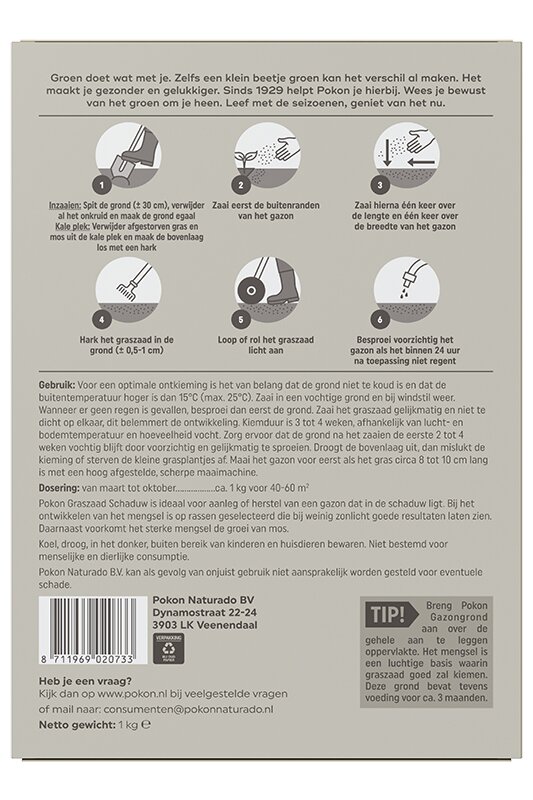 Pokon Graszaad Schaduw is ideaal voor aanleg of herstel van een gazon dat in de schaduw ligt. Bij het ontwikkelen van het mengsel is op rassen geselecteerd die bij weinig zonlicht goede resultaten laten zien. Daarnaast voorkomt het sterke mengsel de groei van mos. Voor een optimale kieming is het van belang dat de grond niet te koud is en dat de buitentemperatuur hoger is dan 15°C (max. 25°C). Zaai in een vochtige grond en bij windstil weer. Wanneer er geen regen is gevallen, besproei dan eerst de grond. Zaai het graszaad gelijkmatig en niet te dicht op elkaar, dit belemmert de ontwikkeling. Kiemduur is 3 tot 4 weken, afhankelijk van lucht- en bodemtemperatuur en hoeveelheid vocht. Zorg ervoor dat de grond na het zaaien de eerste 2 tot 4 weken vochtig blijft door voorzichtig en gelijkmatig te sproeien. Droogt de bovenlaag uit, dan mislukt de kieming of sterven de kleine grasplantjes af. Maai het gazon voor het eerst als het gras circa 8 tot 10 cm lang is met een hoog afgestelde, scherpe maaimachine.
