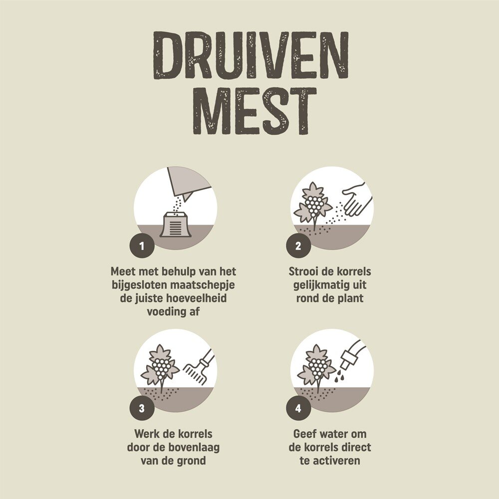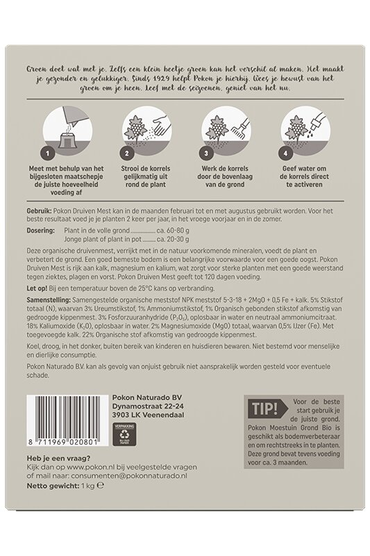 Deze organische druivenmest verrijkt met in de natuur voorkomende mineralen, voedt de plant en verbetert de grond. Een goed bemeste bodem is een belangrijke voorwaarde voor een goede oogst. Pokon Druiven Mest is rijk aan kalk, magnesium en kalium, wat zorgt voor sterke planten met een goede weerstand tegen ziektes, plagen en vorst. Pokon Druiven Mest geeft tot 120 dagen voeding.