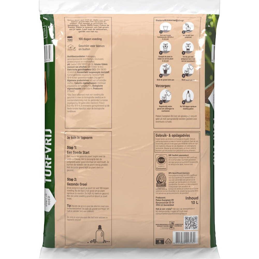 Deze Pokon Bio Potgrond is een goede voedingsbodem voor je planten. De hoofdbestanddelen zorgen voor een goede mix waarin planten zich goed kunnen ontwikkelen. Zowel in de grond als het bovengrondse deel. Er zit voldoende voeding in voor ca. 100 dagen. Door de toevoeging van rijstkaf krijgt de plant beschikking over bouwstoffen die de plant sterker maken. Het gevolg is dat de planten meer weerstand krijgen tegen ziektes en plagen.