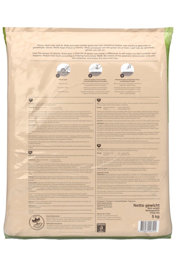 Door je gazon te voeden krijg je een sterk en gezond gazon. De Pokon Bio Gazonmest is zeer geschikt voor elk gazon, het hele jaar door. Door hoogwaardige biologische gazonmeststof bevat een uitgebalanceerde mix van essentiële voedingsstoffen, zakt diep in het gazon dicht bij de wortels en wordt snel opgenomen. Hierdoor zal je gras extra sterk zijn en beter bestand zijn tegen droogte, mos, onkruid en kale plekken. Met extra magnesium waardoor je gazon bovendien een mooie volle groene kleur krijgt. Bemest je gazon 3 x per jaar in het voorjaar, de zomer en het najaar. Let op dat het niet te warm is of dat het een lange periode niet gaat regenen. Deze gazonmest is ook zeer geschikt als bemesting nadat je graszoden hebt gelegd.