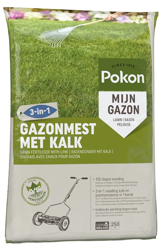 Pokon Gazonmest met Kalk 3-in-1 is zeer geschikt voor elk gazon, het hele jaar door. Deze hoogwaardige gazonmeststof op basis van organisch-minerale meststoffen bevat een uitgebalanceerde mix van essentiële voedingsstoffen. Uniek is de toegevoegde kalk in de korrel. In plaats van apart kalk en voeding te strooien ben je met deze gecombineerde korrel dus in 1 keer klaar. Met extra magnesium en ijzer waardoor je gazon bovendien een mooie volle groene kleur grijgt. Door het hoge kaliumgehalte wordt je gazon sterker, heb je minder last van mos en krijgt het gras meer weerstand tegen vorst in de winter.