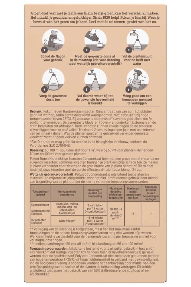 Pokon Bio Tegen Hardnekkige Insecten Polysect Concentraat bestrijdt een groot aantal vretende en zuigende insecten. Sommige insecten brengen je plant ernstige schade toe. Ze maken je plant vatbaarder voor ziektes en de groeikracht van je plant neemt af. Dit middel bestrijdt deze insecten snel, de eerste effecten zijn zichtbaar binnen 24 uur. Pokon Tegen Hardnekkige Insecten Concentraat kan van april tot oktober gebruikt worden, zodra aantasting wordt waargenomen. Niet gebruiken bij hoge temperaturen (boven 25 graden Celsius). Bij voorkeur ’s ochtends of ’s avonds gebruiken, om fel zonlicht te vermijden. De aangetaste bladeren (boven- en onderkant), stengels en de stam bespuiten tot afdruipen. Dode insecten kunnen enkele dagen op de bladeren blijven liggen voor ze eraf vallen. Maximaal 2 toepassingen per jaar, met een interval van minimaal 7 dagen. Was de plantenspuit af na gebruik en verwijder gemorste vloeistof zodat er geen vlekken kunnen ontstaan.
