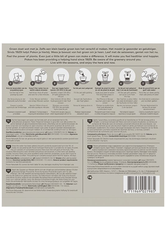 Na het toevoegen van water zet het blok zich uit en verandert het in 10L gebruiksklare potgrond. Pokon Potgrond Compact is geschikt voor alle planten. De grond bestaat uit gecomposteerde kokosvezel, afkomstig van de zachte kokosbast. De kokos zorgt voor een luchtige en open structuur van de grond, waardoor de wortels snel kunnen groeien. Je hoeft bovendien minder vaak water te geven doordat kokosvezels een zeer hoog waterhoudend vermogen hebben. Er zit voldoende voeding in voor ca. 60 dagen.