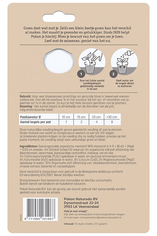 Met de Pokon Bio Terras & Balkon Planten Voedingskegels stimuleer je jouw planten tot uitbundige groei en bloei. Deze natuurlijke voedingskegels geven geleidelijk voeding af aan je planten. Onder invloed van vocht en temperatuur werken ze wel tot 120 dagen. Je bloeiende planten krijgen zo de voeding die ze nodig hebben, precies op het juiste moment. Voor het beste resultaat voed je je planten 2 keer per jaar. Doe dit bij voorkeur 1 keer in het voorjaar bij het op- of verpotten van je planten en 1 keer in de zomer. Zo kun je het hele seizoen genieten van je planten.