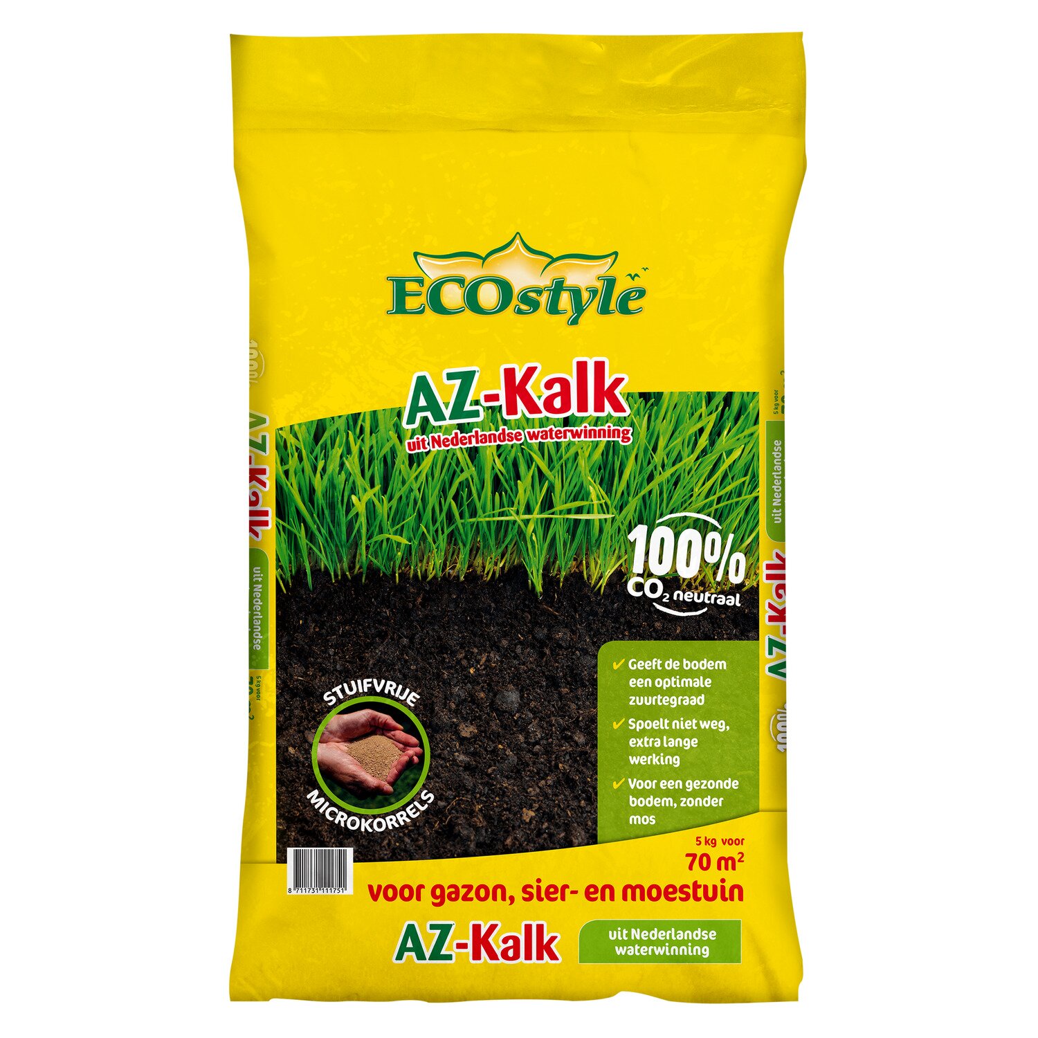 AZ-Kalk van ECOstyle heeft een langdurige nawerking. Bij een zure bodem zal AZ-Kalk een directe werking geven; tot wel 4 maanden lang. Bij een minder zure bodem zal de AZ-Kalk als buffer in de bodem blijven en de zuurgraad geleidelijk bijsturen. AZ-Kalk speelt in op de behoefte van de bodem. De duurzame en innovatieve AZ-Kalk is een zeer hoogwaardig product wat 100% stuifvrij is en gemakkelijk te verwerken. Daarnaast heeft de microkorrel een neutrale kleur.