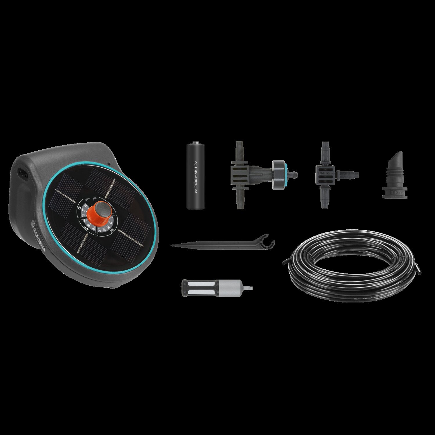 Wie zorgt er voor de plantjes als je er niet bent? De AquaBloom-set van GARDENA is als een goede vriend of buurman die voor je planten zorgt als je er niet bent. Deze slimme set op zonne-energie geeft je balkon- of terras planten water, zelfs als je niet thuis bent. Het systeem werkt onafhankelijk, wat betekent dat je geen stroompunt of een kraanaansluiting nodig hebt. Het enige dat nodig is voor je favoriete planten is een gevulde watertank. Het complete automatische druppelirrigatiesysteem voor maximaal 20 planten bestaat uit een pomp om water aan te zuigen, een besproeiingscomputer en een zonnepaneel. De set is zeer compleet met koppelstukken, afsluitdoppen, twintig meter verdeelbuis en een filter. Met 14 verschillende vooraf ingestelde bewateringsprogramma's bepaal je eenvoudig de tijd en duur van de gewenste bewatering. De zeer stille pomp transporteert het gefilterde water uit het waterreservoir naar de planten, die vervolgens gelijkmatig worden bevochtigd met behulp van het geavanceerde druppelirrigatiesysteem. Hoogteverschillen vormen geen probleem door drukcompenserende druppelaars. Elke druppelaar is geschikt voor maximaal 300 ml. Installeren van de AquaBloom-set is zeer eenvoudig zonder gebruik van gereedschap. De AquaBloom is flexibel en praktisch in gebruik. Plaats op de zonnigste plek, hangend aan de muur, aan de rand van de pot of staand op een tafel. Weg met tijdrovend water geven, maar en geniet het hele seizoen van je balkon en terras met prachtige en goed verzorgde planten en bloemen - ongeacht hoe lang je op vakantie of op zakenreis bent.