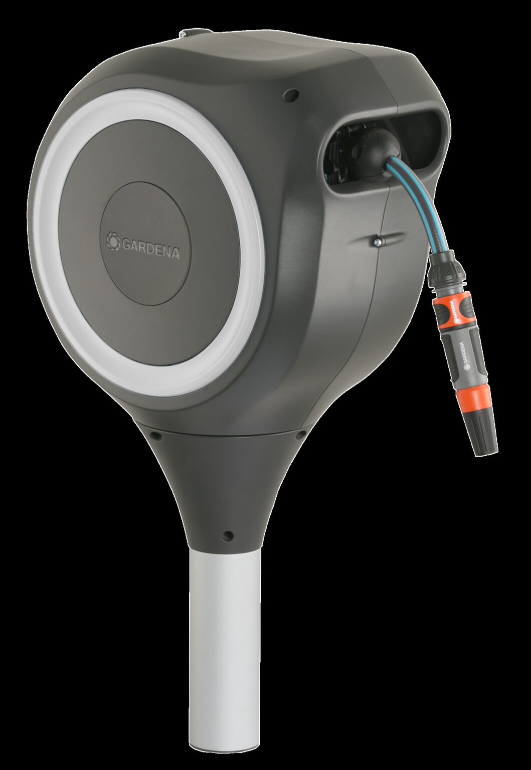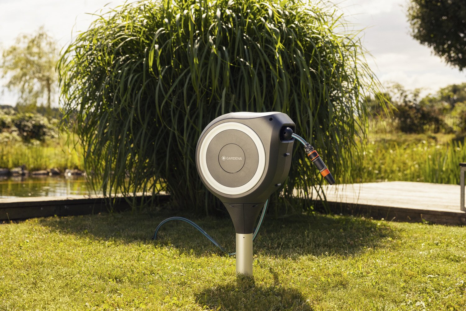 Bewatering die altijd gebruiksklaar is: De GARDENA slangenbox RollUp S is geen gewone opbergruimte voor slangen. Met deze goed ontworpen slangenbox kunt u moeiteloos uw tuin bewateren. U kunt uw kleine tuin eenvoudig bewateren met maximale bewegingsvrijheid. Hij staat op een stevige metalen pen, zodat u hem overal in uw tuin kunt plaatsen zonder een muur te beschadigen. De grondpen wordt met een montagestang in de grond geschroefd en is daarom extreem stabiel. Voor gebruik hoeft u de tuinslang alleen maar uit te rollen tot maximaal 15 meter en kunt u meteen beginnen met bewateren. Dankzij de ingebouwde korte vergrendelingspunten kunt u de slang moeiteloos hanteren en automatisch op de gewenste lengte afrollen. Door het innovatieve ontwerp kan de slangenbox 360 graden worden gedraaid en kunt u elke hoek van uw tuin bereiken. De slangenbox volgt uw bewegingen tijdens het bewateren en voorkomt dat de waterslang knikt of in de war raakt. Bovendien maakt deze slangenbox het lastige oprollen overbodig, hoeft u niet te bukken en blijven uw handen schoon en droog: door kort aan de niet gerolde slang te trekken wordt de geïntegreerde veer geactiveerd, die de slang volledig automatisch en betrouwbaar oprolt. Om blokkades of verdraaiingen te voorkomen houdt een slanggeleider de tuinslang op zijn plaats en zorgt de RollControl-technologie voor veilig en gecontroleerd oprollen. De box is afgesteld op de hoogte van de GARDENA robotmaaiers, zodat het gazon rond de slangenbox altijd wordt onderhouden en gemaaid. Het hoogwaardige materiaal biedt bescherming tegen UV en vorst, de box kan het hele jaar door in de tuin blijven en staat borg voor een lange levensduur en gebruik zonder onderhoud. De box is zeer compact en stijlvol ontworpen, zodat deze eenvoudig in elke tuin kan worden geïntegreerd. De slangenbox wordt geleverd met een flexibele aansluitslang, alle benodigde montageonderdelen, de Original GARDENA System elementen en een sproeier met twee verschillende sproeipatronen. GARDENA geeft vijf jaar garantie op de slangenbox RollUp S.