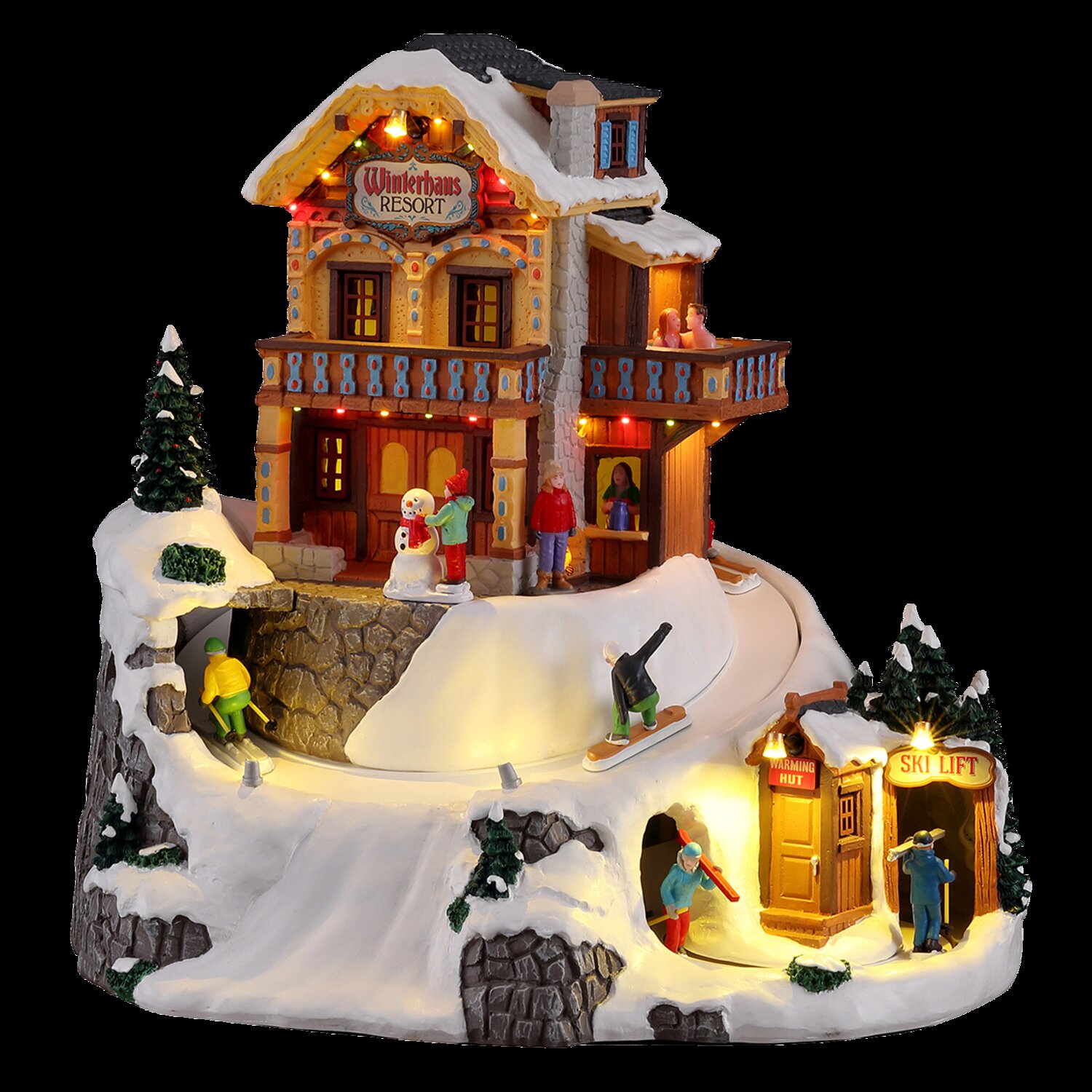 WINTERHAUS RESORT, WITH 4.5V ADAPTOR van Lemax is een kersthuisje met bewegende en verlichte elementen. Dit zorgt voor een extra levendig effect in uw kerstdorp. De skilift, skiыrs en en het resort zorgen voor een gezellige wintersport ambiance.
