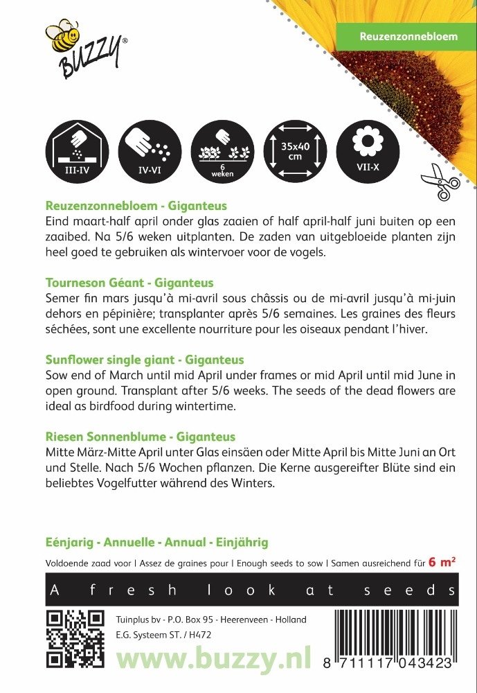 Reuzenzonnebloem - Giganteus Eind maart-half april onder glas zaaien of half april-half juni buiten op een zaaibed. Na 5/6 weken uitplanten. De zaden van uitgebloeide planten zijn heel goed te gebruiken als wintervoer voor de vogels.