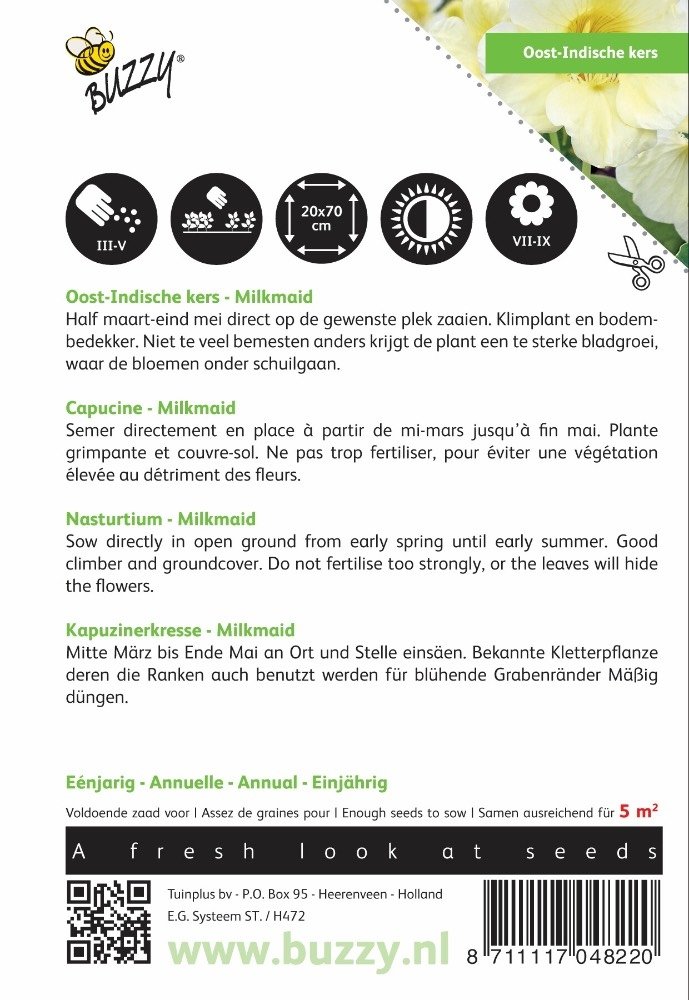 Oost-Indische kers - Milkmaid Half maart-eind mei direct op de gewenste plek zaaien. Klimplant en bodembedekker. Niet te veel bemesten anders krijgt de plant een te sterke bladgroei, waar de bloemen onder schuilgaan.