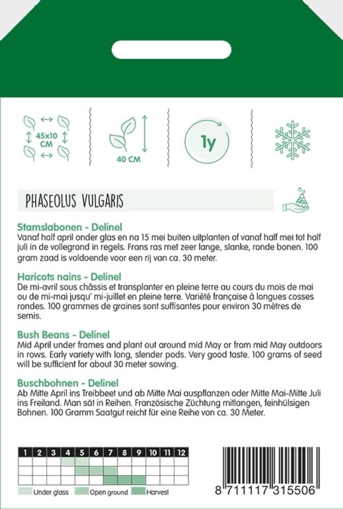 Stamslabonen - Delinel Vanaf half april onder glas en na 15 mei buiten uitplanten of vanaf half mei tot half juli in de vollegrond in regels. Frans ras met zeer lange, slanke, ronde bonen. 100 gram zaad is voldoende voor een rij van ca. 30 meter.