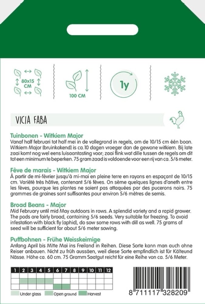 Tuinbonen - Witkiem Major Vanaf half februari tot half mei in de vollegrond in regels, om de 10/15 cm één boon. Witkiem Major (bruinkokend) is ca.10 dagen vroeger dan de gewone witkiem. Bij late zaai komt nog wel eens luisaantasting voor; zaai flink wat dille tussen de regels om dit tot een minimum te beperken. 75 gram zaad is voldoende voor een rij van ca. 5/6 meter.