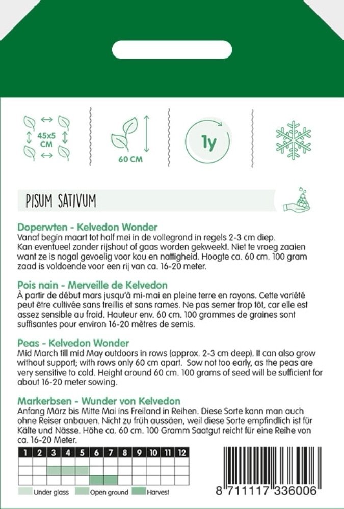 Doperwten - Kelvedon Wonder Vanaf begin maart tot half mei in de vollegrond in regels 2-3 cm diep. Kan eventueel zonder rijshout of gaas worden gekweekt. Niet te vroeg zaaien want ze is nogal gevoelig voor kou en nattigheid. Hoogte ca. 60 cm. 100 gram zaad is voldoende voor een rij van ca. 16-20 meter.