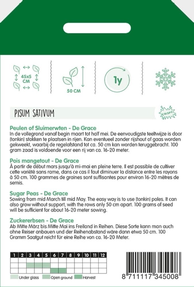 Peulen of Sluimerwten - De Grace In de vollegrond vanaf begin maart tot half mei. De eenvoudigste teeltwijze is door (tonkin) stokken te plaatsen in rijen. Kan eventueel zonder rijshout of gaas worden gekweekt, waarbij de regelafstand tot ca. 50 cm kan worden teruggebracht. 100 gram zaad is voldoende voor een rij van ca. 16-20 meter.
