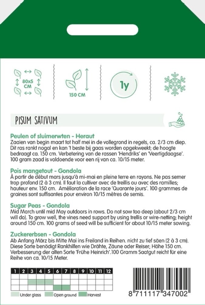 Peulen of sluimerwten - Heraut Zaaien van begin maart tot half mei in de vollegrond in regels, ca. 2/3 cm diep. Dit ras rankt nogal en kan ‘t beste bij gaas worden opgekweekt; de hoogte bedraagt ca. 150 cm. Verbetering van de rassen ‘Hendriks’ en ‘Veertigdaagse’. 100 gram zaad is voldoende voor een rij van ca. 10/15 meter.