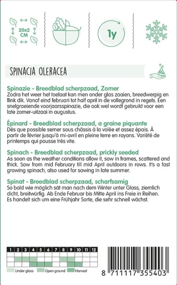Spinazie - Breedblad scherpzaad, Zomer Zodra het weer het toelaat kan men onder glas zaaien, breedwerpig en flink dik. Vanaf eind februari tot half april in de vollegrond in regels. Een snelgroeiende voorjaarsspinazie, die ook wel wordt gebruikt voor een late zomer-uitzaai in augustus.