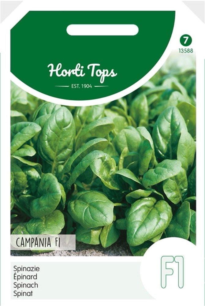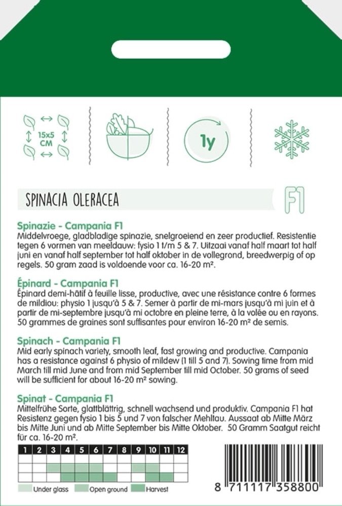 Spinazie - Campania F1 Middelvroege, gladbladige spinazie, snelgroeiend en zeer productief. Resistentie tegen 6 vormen van meeldauw: fysio 1 t/m 5 & 7. Uitzaai vanaf half maart tot half juni en vanaf half september tot half oktober in de vollegrond, breedwerpig of op regels. 50 gram zaad is voldoende voor ca. 16-20 m².
