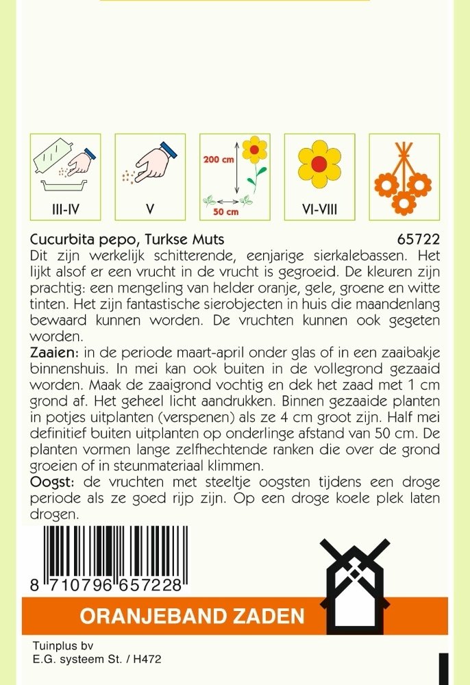 Dit zijn werkelijk schitterende, eenjarige sierkalebassen. Het lijkt alsof er een vrucht in de vrucht is gegroeid. De kleuren zijn prachtig: een mengeling van helder oranje, gele, groene en witte tinten. Het zijn fantastische sierobjecten in huis die maandenlang bewaard kunnen worden. De vruchten kunnen ook gegeten worden. Zaaien: in de periode maart-april onder glas of in een zaaibakje binnenshuis. In mei kan ook buiten in de vollegrond gezaaid worden. Maak de zaaigrond vochtig en dek het zaad met1 cm grond af. Het geheel licht aandrukken. Binnen gezaaide planten in potjes uitplanten (verspenen) als ze 4 cm groot zijn. Half mei definitief buiten uitplanten op onderlinge afstand van 50 cm. De planten vormen lange zelfhechtende ranken die over de grond groeien of in steunmateriaal klimmen. Oogst: de vruchten met steeltje oogsten tijdens een droge periode als ze goed rijp zijn. Op een droge koele plek laten drogen.