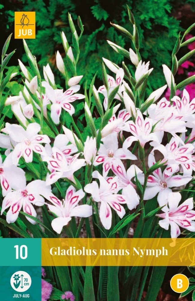 De kleinbloemige nanus gladiool 'Nymph' is een echte zomerbloeier die wel tot in de herfst in bloei kan staan. Deze bijzondere kleinbloemige gladiool wordt 60-70 cm. en is ook een prachtige snijbloem. Deze gladiool 'Nymph' zeer rijkbloeiend en mag niet ontbreken in uw zomerbloementuin.