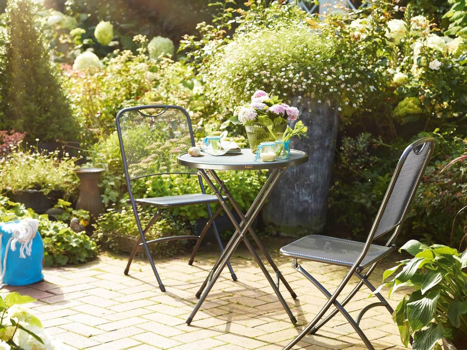 Lekker ongecompliceerd met de balkonset CALVIA. Neem plaats en schenk uzelf een heerlijke ontspannen namiddag in de tuin. Het decente design en de beproefde Kettler kwaliteit van de balkonset nodigen daartoe uit. De balkonset bestaat uit 2 balkonklapstoelen en een klaptafel Ø 60cm
