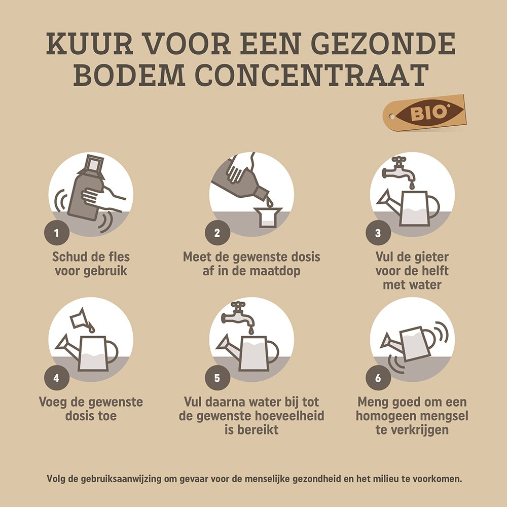 Behandel het liefst bij regenachtig weer, want de grond dient vochtig te zijn. Mocht het niet geregend hebben, beregen dan eerst de grond. Schud de fles voor gebruik. Meet de gewenste dosis af in de maatdop. Vul de gieter voor de helft met water. Voeg de gewenste dosis toe. Vul daarna water bij tot de gewenste hoeveelheid is bereikt. Meng goed om een homogeen mengsel te verkrijgen. Giet het mengsel op de grond bij de plant. Wij raden aan om direct na behandeling de grond nogmaals te besproeien (10mm).