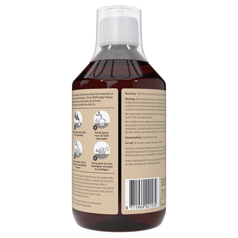 Een gezonde en weerbare plant is minder vatbaar voor invloeden van buitenaf, zoals hitte, droogte en daarmee indirect tegen aanvallen van schadelijke bodemaaltjes. Veelvoorkomende schadelijke aaltjes in de bodem zijn rozen-aaltjes (rozenmoeheid), diverse wortelaaltjes, aardappelcystenaaltjes en bietencysteaaltjes. Het middel wordt opgenomen door de wortel van de planten, die een sterker afweersysteem ontwikkelen. Na behandeling kunnen de vruchten zonder problemen gegeten worden. Was je groenten wel even voor je ze gaat eten. Pokon Bio Plantkuur voor Bodemaaltjes Gevoelige Planten Concentraat is traditioneel kruidenextract ter verhoging van de weerbaarheid. De kruiden ondersteunen het natuurlijk herstellend vermogen, werken verzorgend, voedend en plantversterkend. Het is dus geen pesticide. Pokon Bio Kuur voor Bodemaaltjes Gevoelige Planten Concentraat kan gedurende de hele groeiperiode gebruikt worden. Preventief toedienen vanaf het moment dat de plant of struik begint uit te lopen. Herhaal de behandeling iedere 4 weken.