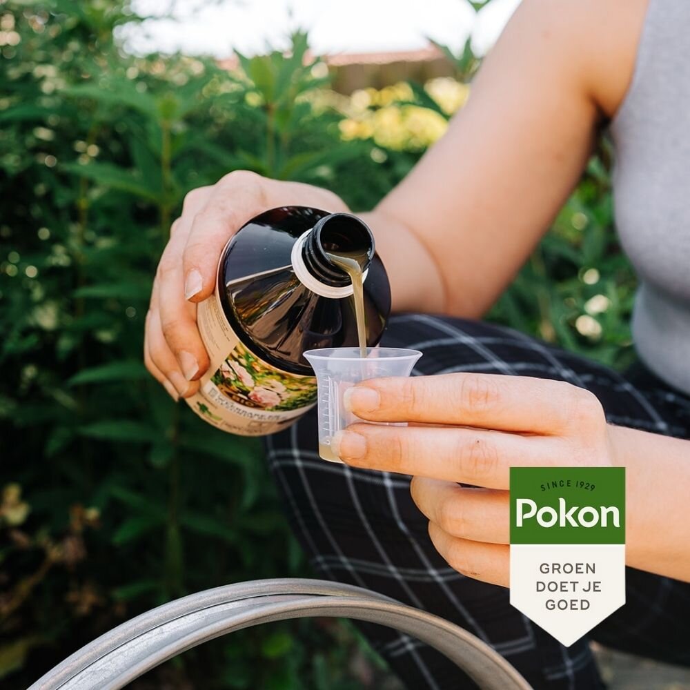Een gezonde en weerbare plant is minder vatbaar voor invloeden van buitenaf, zoals hitte, droogte en daarmee indirect tegen schimmelaantastingen. Veel voorkomende schimmels op planten zijn o.a. meeldauw en roest. Pokon Bio Plantkuur Schimmelgevoelige Planten Concentraat is een traditioneel kruidenextract ter verhoging van de weerbaarheid. De kruiden ondersteunen het natuurlijk herstellend vermogen, werken verzorgend, voedend en plantversterkend. Het is dus geen pesticide. Het concentraat is geschikt voor alle buitenplanten zoals sier-, fruit- en moestuinplanten. Na behandeling kunnen de vruchten zonder problemen gegeten worden. Was je groenten wel even voor je ze gaat eten. Pokon Bio Kuur voor Schimmelgevoelige Planten Concentraat kan gedurende de hele groeiperiode gebruikt worden. Herhaal de behandeling iedere 4 weken. Mocht het nodig zijn, kan de behandeling sneller herhaald worden. Het concentraat kan op 2 manieren worden toegepast, via bladbehandeling of via bodembehandeling, waarbij bladbehandeling de voorkeur heeft. Bij bladbehandeling wordt het middel via het blad opgenomen. Bespuit de bladeren (boven- en onderkant) tot afdruipen. Deze methode niet toepassen bij hoge temperaturen (boven 25°C). Bij voorkeur 's ochtends of 's avonds gebruiken, om fel zonlicht te vermijden. Gebruik dit middel op een dag met zacht weer, zonder regen en wind. Regen binnen 6 uur na toepassing kan de werking doen verminderen. Bij bodembehandeling wordt het middel via de wortels opgenomen. Maak de grond eerst oppervlakkig los met de hand, hark of schoffel. Giet daarna het mengsel op de grond bij de plant. Het advies is om direct na behandeling de grond goed te beregenen (5-10 mm).