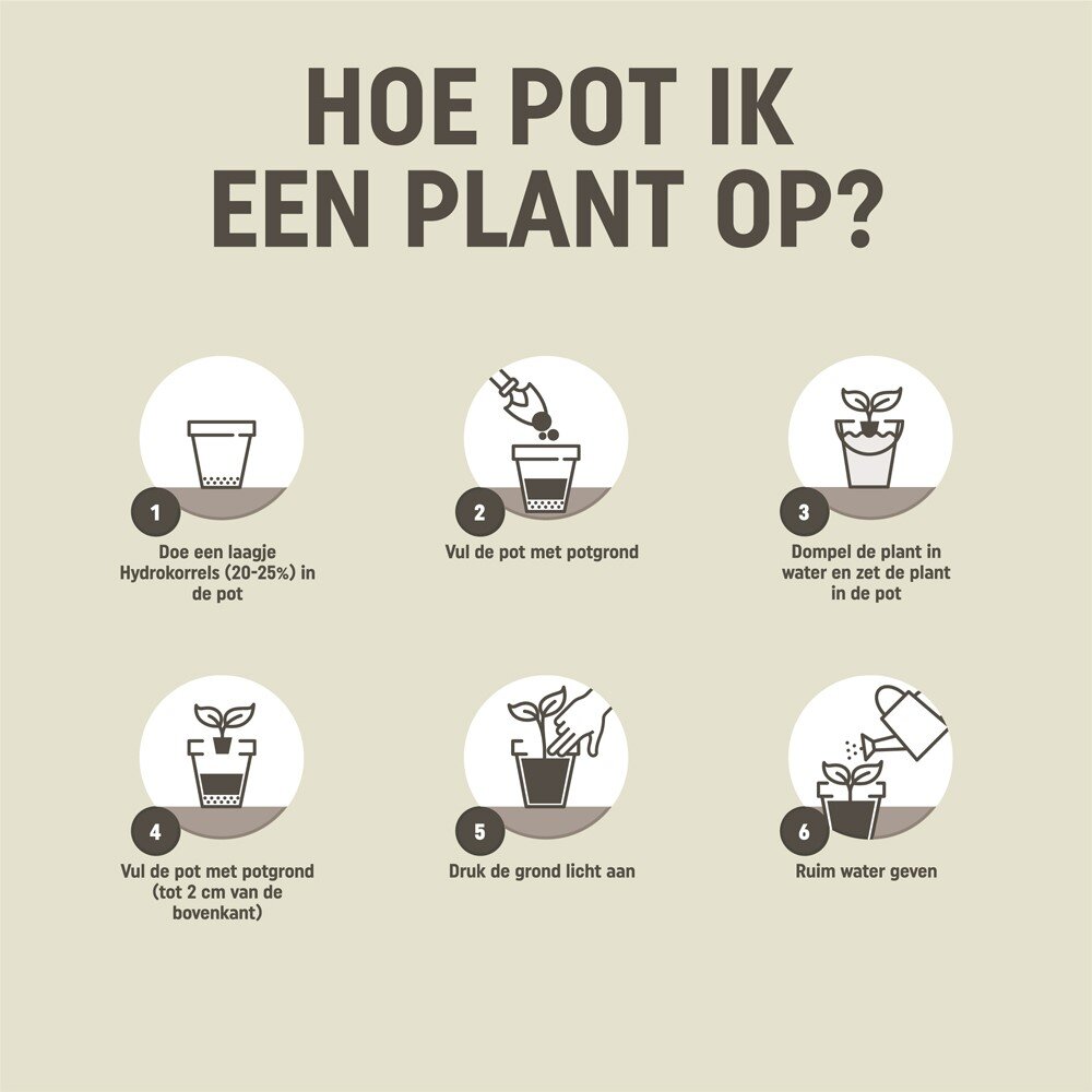 Doe een laagje Hydrokorrels (20-25%) in de pot. Vul de pot met potgrond. Dompel de plant in water en zet de plant in de pot. Vul de pot met potgrond (tot 2 cm) van de bovenkant. Druk de grond licht aan. Ruim water geven.