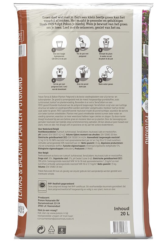 Pokon Potgrond Terras & Balkon Planten is de beste voedingsbodem voor al je terras- en balkonplanten. De grond is samengesteld met de meest hoogwaardige grondstoffen, zoals turfstrooisel, tuinturf en plantenvoeding. Bovendien is er extra TerraCottem en een PEFC-gecertificeerde houtvezel aan de potgrond toegevoegd. TerraCottem zorgt voor een luchtige structuur en water en voedingstoffen worden veel beter vastgehouden, hierdoor hoef je minder vaak water te geven. PEFC-gecertificeerde houtvezel maakt de grond luchtiger, waardoor de wortels zich beter kunnen ontwikkelen. Planten met goed ontwikkelde wortels kunnen beter water en voeding opnemen, waardoor ze meer weerstand hebben tegen ziektes en plagen. Op deze manier draagt houtvezel bij aan een betere groei en mooiere bloei van je planten. Door de toevoeging van gemalen houtvezel kan tijdelijk enige schimmelvorming optreden. Dit kan absoluut geen kwaad voor plant, mens en dier. Het draagt zelfs in positieve zin bij aan het actieve bodemleven.