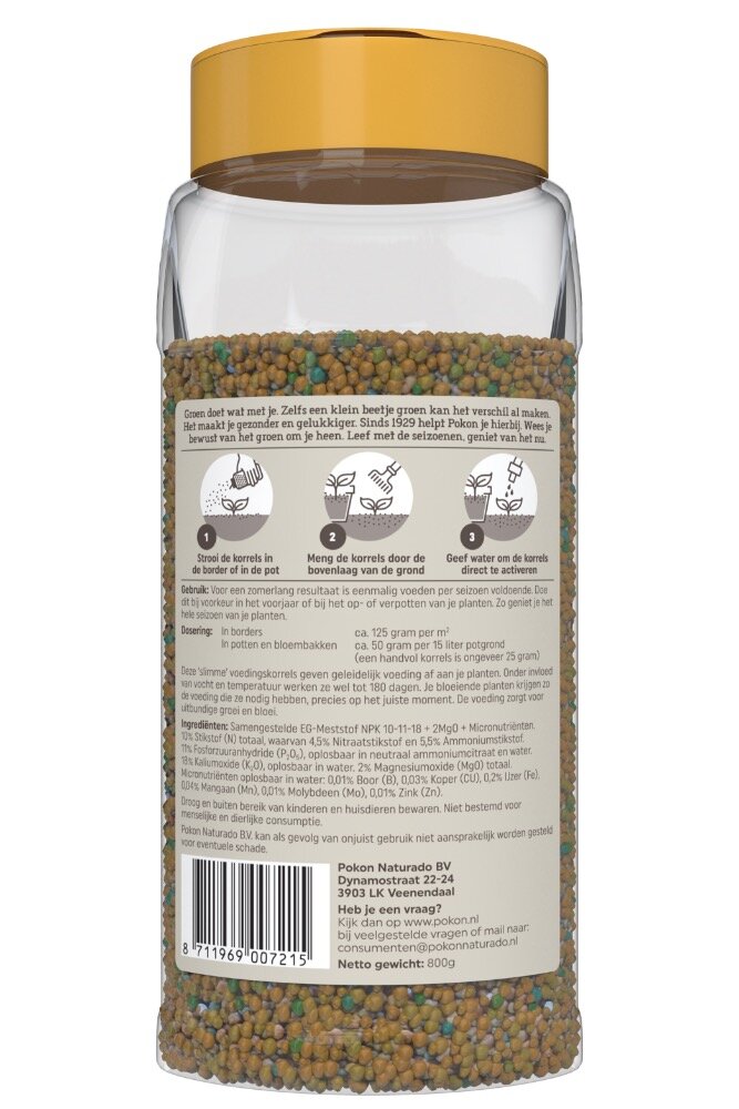 Pokon Terras & Balkon Planten Voedingskorrels zijn ‘slimme’ voedingskorrels die geleidelijk voeding afgeven aan je planten. Onder invloed van vocht en temperatuur werken ze wel tot 180 dagen. Je planten krijgen zo de voeding die ze nodig hebben, precies op het juiste moment. De voeding zorgt voor groei en bloei. Voor een zomerlang resultaat is eenmalig voeden per seizoen voldoende. Doe dit bij voorkeur in het voorjaar of bij het op- of verpotten van je planten. Zo geniet je het hele seizoen van je planten.