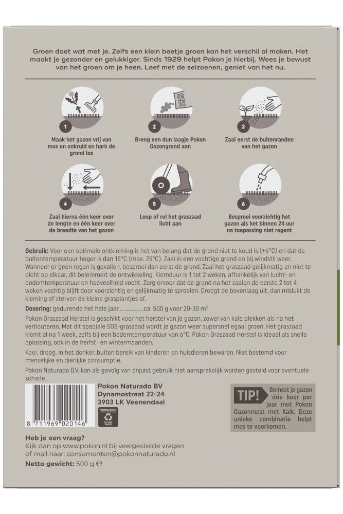Pokon Graszaad Herstel is geschikt voor het herstel van je gazon, zowel van kale plekken als na het verticuteren. Met dit speciale SOS-graszaad wordt je gazon weer supersnel egaal groen. Het graszaad kiemt al na 1 week, zelfs bij een bodemtemperatuur van 6°C. Pokon Graszaad Herstel is ideaal als snelle oplossing, ook in de herfst- en wintermaanden. Voor een optimale ontkieming is het van belang dat de grond niet te koud is (+6°C.) en dat de buitentemperatuur hoger is dag 15°C (max 25°C). Zaai in een vochtige grond en bij windstil weer. Wanneer er geen regen is gevallen, besproei dan eerst de grond. Zaai het graszaad gelijkmatig en niet te dicht op elkaar, dit belemmert de ontwikkeling. Kiemduur is 1 tot 2 weken, afhankelijk van lucht- en bodemtemperatuur en hoeveelheid vocht. Zorg ervoor dat de grond na het zaaien de eerste 2 tot 4 weken vochtig blijft door voorzichtig en gelijkmatig te sproeien. Droogt de bovenlaag uit, dan mislukt de kieming of sterven de kleine grasplantjes af.