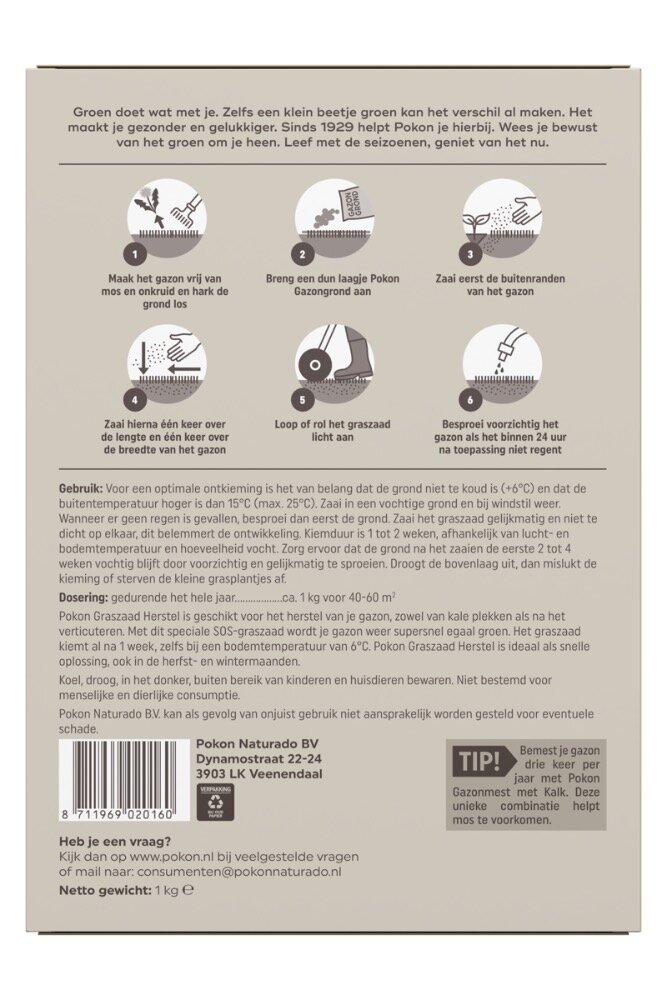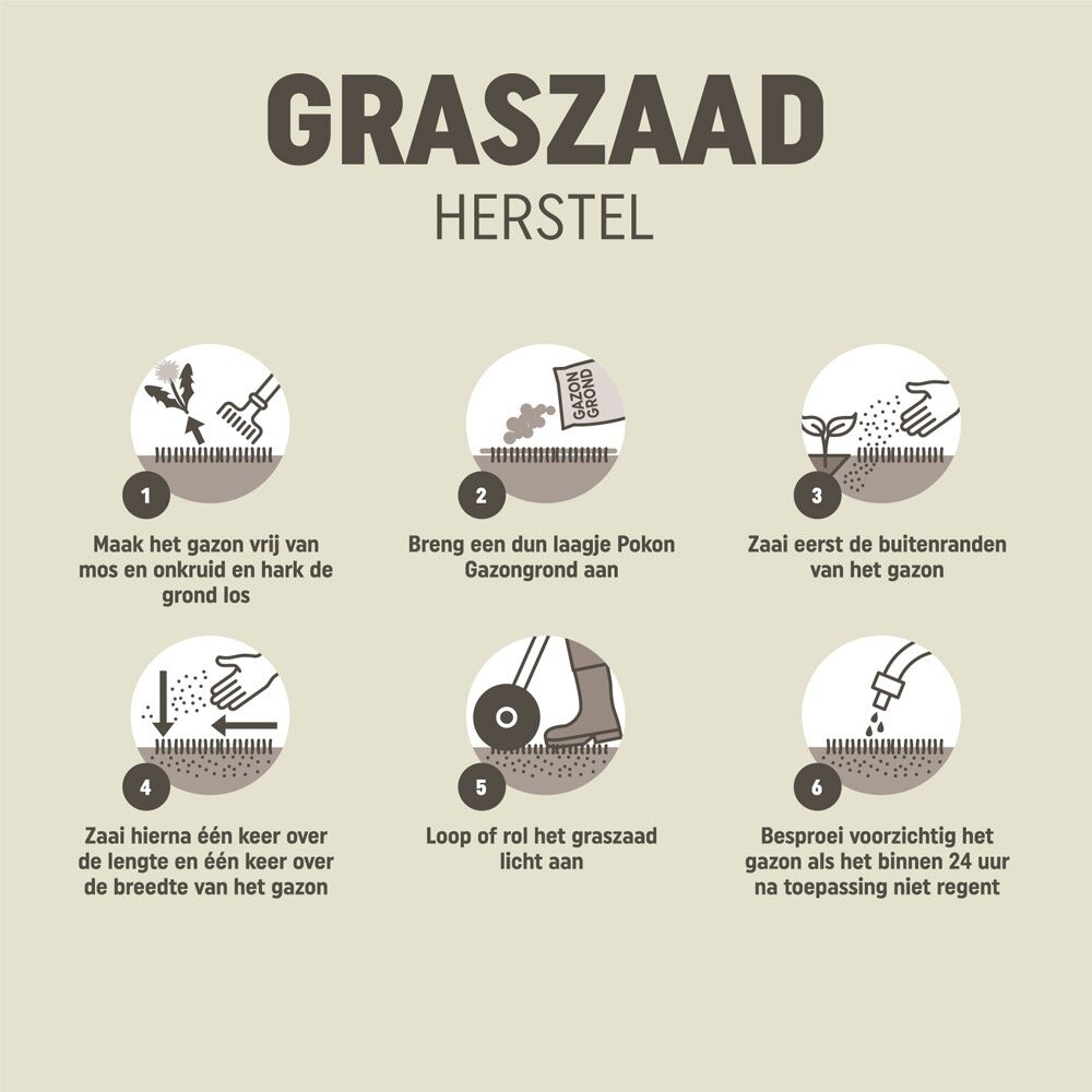Pokon Graszaad Herstel is geschikt voor het herstel van je gazon, zowel van kale plekken als na het verticuteren. Met dit speciale SOS-graszaad wordt je gazon weer supersnel egaal groen. Het graszaad kiemt al na 1 week, zelfs bij een bodemtemperatuur van 6°C. Pokon Graszaad Herstel is ideaal als snelle oplossing, ook in de herfst- en wintermaanden. Voor een optimale ontkieming is het van belang dat de grond niet te koud is (+6°C.) en dat de buitentemperatuur hoger is dag 15°C (max 25°C). Zaai in een vochtige grond en bij windstil weer. Wanneer er geen regen is gevallen, besproei dan eerst de grond. Zaai het graszaad gelijkmatig en niet te dicht op elkaar, dit belemmert de ontwikkeling. Kiemduur is 1 tot 2 weken, afhankelijk van lucht- en bodemtemperatuur en hoeveelheid vocht. Zorg ervoor dat de grond na het zaaien de eerste 2 tot 4 weken vochtig blijft door voorzichtig en gelijkmatig te sproeien. Droogt de bovenlaag uit, dan mislukt de kieming of sterven de kleine grasplantjes af.