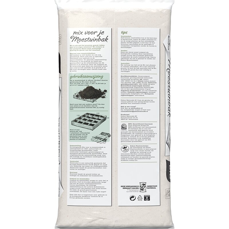 Zelf kweken is veel leuker en ook erg gemakkelijk. Deze rijke mix is speciaal ontwikkeld voor gebruik in de moestuinbakken en potten. De speciale samenstelling is bewezen in de praktijk en heeft een gunstig effect op de ontwikkeling van plantjes in je moestuin. Door de compost en de vermiculiet gaat deze mix meerdere jaren mee zodat je niet jaarlijks al je grond in je kweekbak moet vervangen maar slechts hoeft aan te vullen. De biologische Mix voor je Moestuinbak is samengesteld uit 100% natuurlijke en hoogwaardige grondstoffen, zoals tuinturf, vermiculiet, compost, houtvezel en biologisch gecertificeerde meststoffen. Deze uitgebalanceerde samenstelling zorgt voor een luchtige en vruchtbare voedingsbodem in moestuinbakken en -potten. Vermiculiet is een natuurlijk gesteente dat bij hoge temperaturen wordt gepoft en zorgt voor buffering van water en voedingsstoffen. Samen met de houtvezel maakt het de grond bovendien veel lichter en luchtiger. De houtvezel in deze mix stimuleert daarnaast het bodemleven. Compost en meststoffen zorgen ervoor dat je groenten, fruit en kruiden gedurende lange tijd over de juiste voedingselementen kunnen beschikken. De luchtige samenstelling en het actieve bodemleven zorgen ervoor dat planten zich zowel boven als onder de grond goed kunnen ontwikkelen. De basis voor een rijke oogst!
