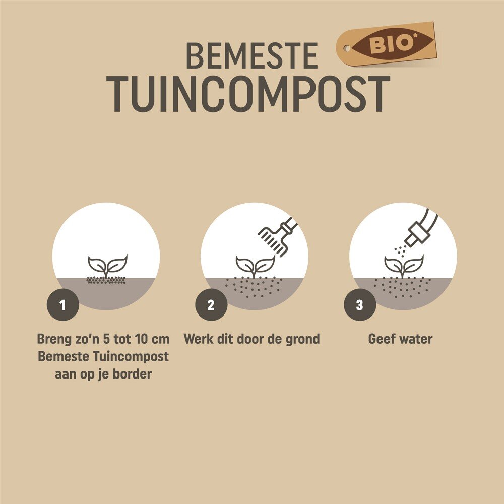 Breng zo’n 5 tot 10 cm Bemeste Tuincompost aan op je border. Werk dit door de grond. Geef water.