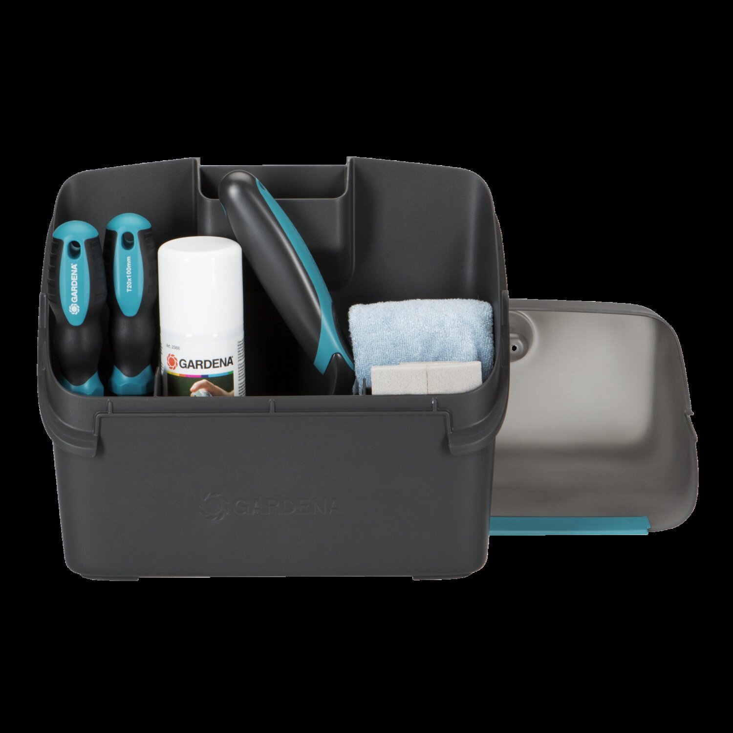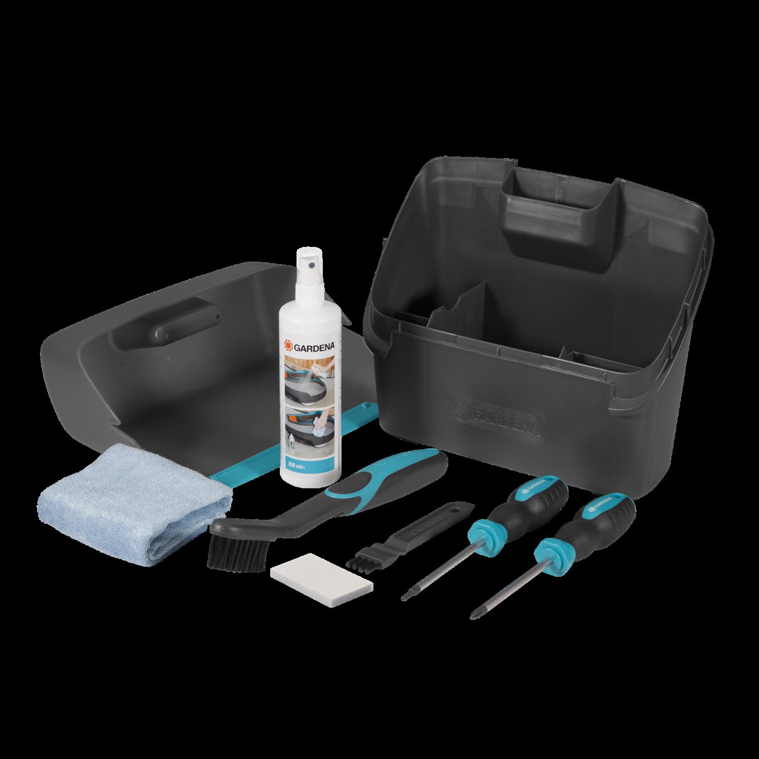 De GARDENA Onderhoudsset voor robotmaaiers bevat een reinigingspad tegen vuil, twee verschillende borstels, een reinigingsspray en een speciale schroevendraaier om bijvoorbeeld zelf de messen te vervangen.