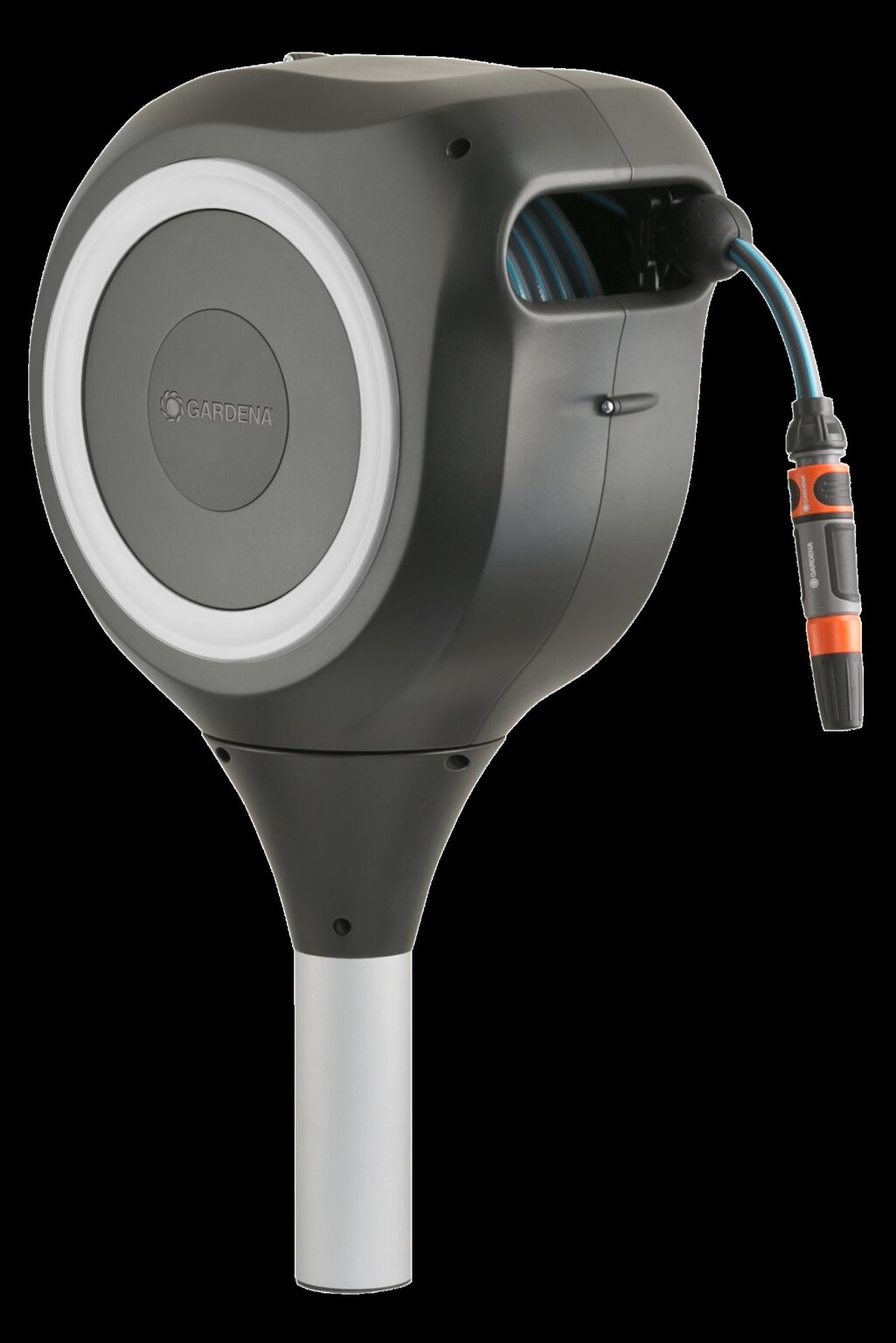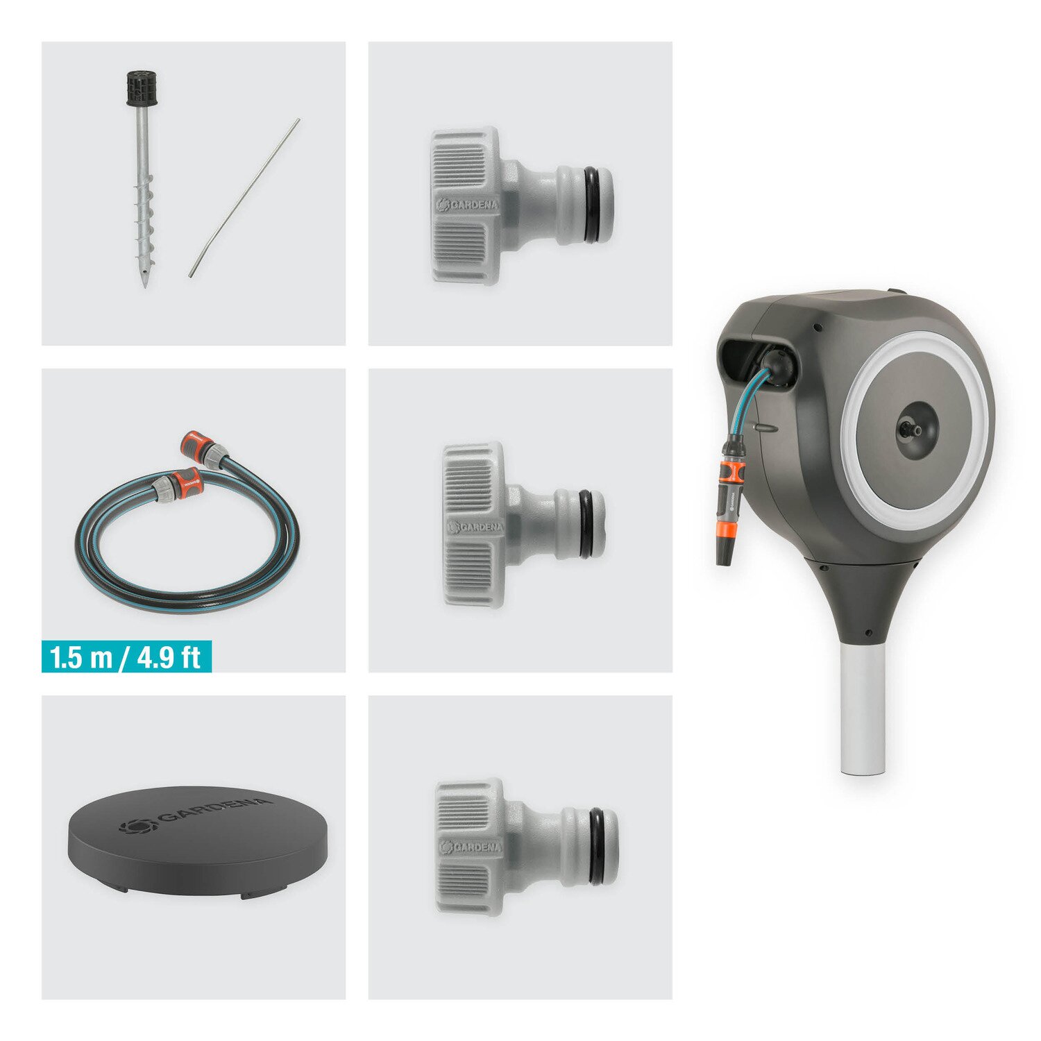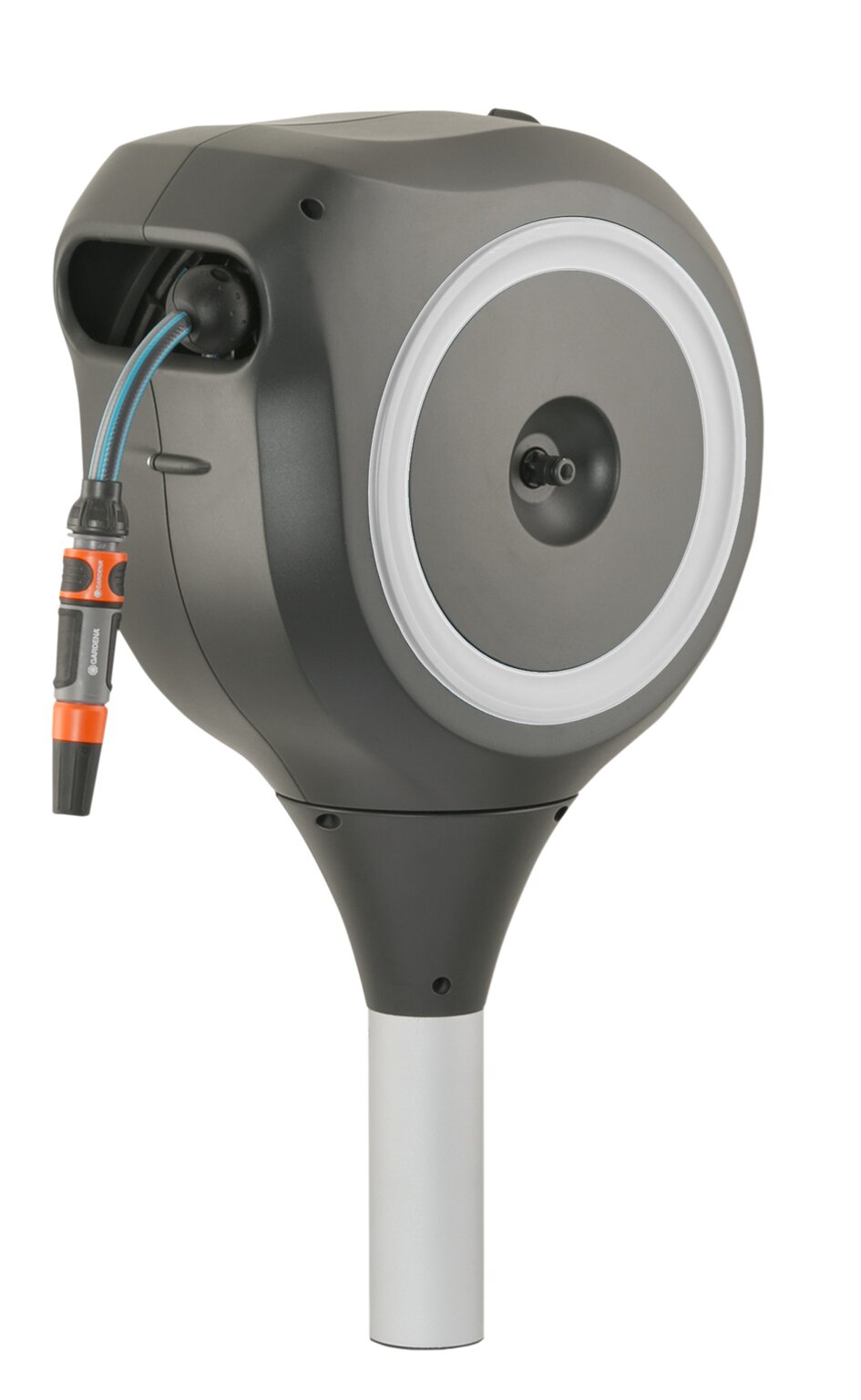 De slangenbox RollUp M van GARDENA biedt niet alleen een veilige en ruimtebesparende opslag voor uw tuinslang, maar u zult ook blij zijn met de moeiteloze bewatering van uw middelgrote tuin. De handige slangenbox wordt in de grond verankerd met een stevige standaard op een plek naar keuze in een bloembed of op het gazon. Met behulp van een bevestigingsstang kunt u de metalen pen nog eenvoudiger in de grond schroeven. Voor gebruik trekt u de 20 meter lange slang uit tot de gewenste lengte en kunt u meteen beginnen met bewateren. Dankzij de ingebouwde korte vergrendelingspunten is het hanteren van de tuinslang eenvoudiger dan ooit: zodra u stopt met de slang, wordt de vergrendeling automatisch vastgezet op de gewenste slanglengte. Het innovatieve ontwerp kan 360 graden worden gedraaid, voor maximale flexibiliteit bij het bewateren van de tuin. De box volgt altijd uw bewegingen, zodat u elke hoek van uw tuin gemakkelijk kunt bereiken zonder dat de tuinslang knikt of in de knoop raakt. Bovendien bespaart u met deze slangenbox vermoeiend opwikkelen en oprollen en hebt u geen last van vuile handen: door kort aan het uiteinde van de slang te trekken, wordt de vergrendeling ontgrendeld en wordt de tuinslang dankzij een geïntegreerde stalen veer volledig automatisch en betrouwbaar opgerold. De box heeft een praktische slanggeleider die de slang op zijn plaats houdt, zodat er geen blokkades of knopen optreden. De innovatieve RollControl-technologie zorgt voor veilig, gecontroleerd en moeiteloos oprollen zonder dat de slang in de war raakt. Het hoogwaardige materiaal is bestand tegen UV en vorst, heeft een lange levensduur en is onderhoudsvrij. De box is zeer compact en stijlvol ontworpen, zodat deze eenvoudig in elke tuin kan worden geïntegreerd. Hij is bovendien afgesteld op de hoogte van de GARDENA robotmaaiers, zodat het gazon rond de slangenbox altijd wordt onderhouden en gemaaid. De slangenbox wordt geleverd met een flexibele aansluitslang, alle benodigde montageonderdelen, de Original GARDENA System elementen en een sproeier met twee verschillende sproeipatronen. GARDENA geeft vijf jaar garantie op de slangenbox RollUp M. Bewatering die altijd gebruiksklaar is.