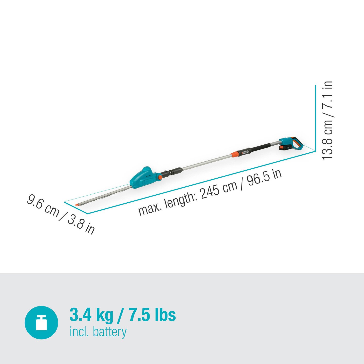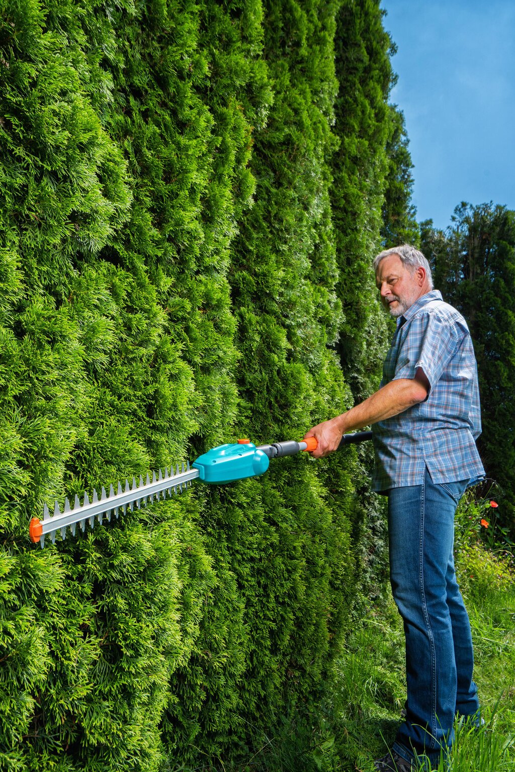 "Met de GARDENA telescopische accu-heggenschaar THS 42/18V P4A kunnen zelfs drie meter hoge heggen moeiteloos worden gesnoeid. Je hoeft geen aandacht te besteden aan stroomkabels en hebt geen ladder nodig, want je kunt altijd met beide voeten op een vaste ondergrond staan. De telescopische heggenschaar weegt slechts 3,4 kilogram met geplaatste accu, het handvat is ergonomisch vormgegeven en heeft een ideaal zwaartepunt. Dit betekent dat hij comfortabel en veilig in de hand ligt, zelfs als de telescoopsteel volledig is uitgeschoven. Zelfs heggen kunnen vanaf de grond in vorm worden gebracht. De kop van de trimmer is kantelbaar - een functie die ook erg handig is bij het knippen van bodembedekkers. Je hoeft niet te bukken en het ligt gemakkelijk op je knieën. Takken en twijgen tot 16 millimeter dik vallen zonder problemen; de ideale bladgeometrie zorgt ervoor dat elke snede efficiënt en schoon wordt gemaakt. Dankzij de meslengte van 42 centimeter zijn heggen snel over de hele breedte te vormen. Een duidelijk zichtbare LED-indicator toont het huidige laadniveau van de accu. Zo weet je altijd hoelang je door kunt werken. Voor transport is de heggenschaar snel en zonder gereedschap in twee delen te scheiden, zodat hij ook gemakkelijk kan worden opgeborgen. De GARDENA accu-telescopische heggenschaar THS 42/18V P4A wordt geleverd als een gebruiksklare set met een oplader en een 18V POWER FOR ALL-accu met een maximale looptijd van 100 minuten. De POWER FOR ALL ALLIANCE is een van de grootste merkoverschrijdende accu-allianties van toonaangevende fabrikanten. De accu is daarom compatibel met tal van andere gereedschappen in huis en tuin. Je bespaart geld en blijft te allen tijde flexibel!"