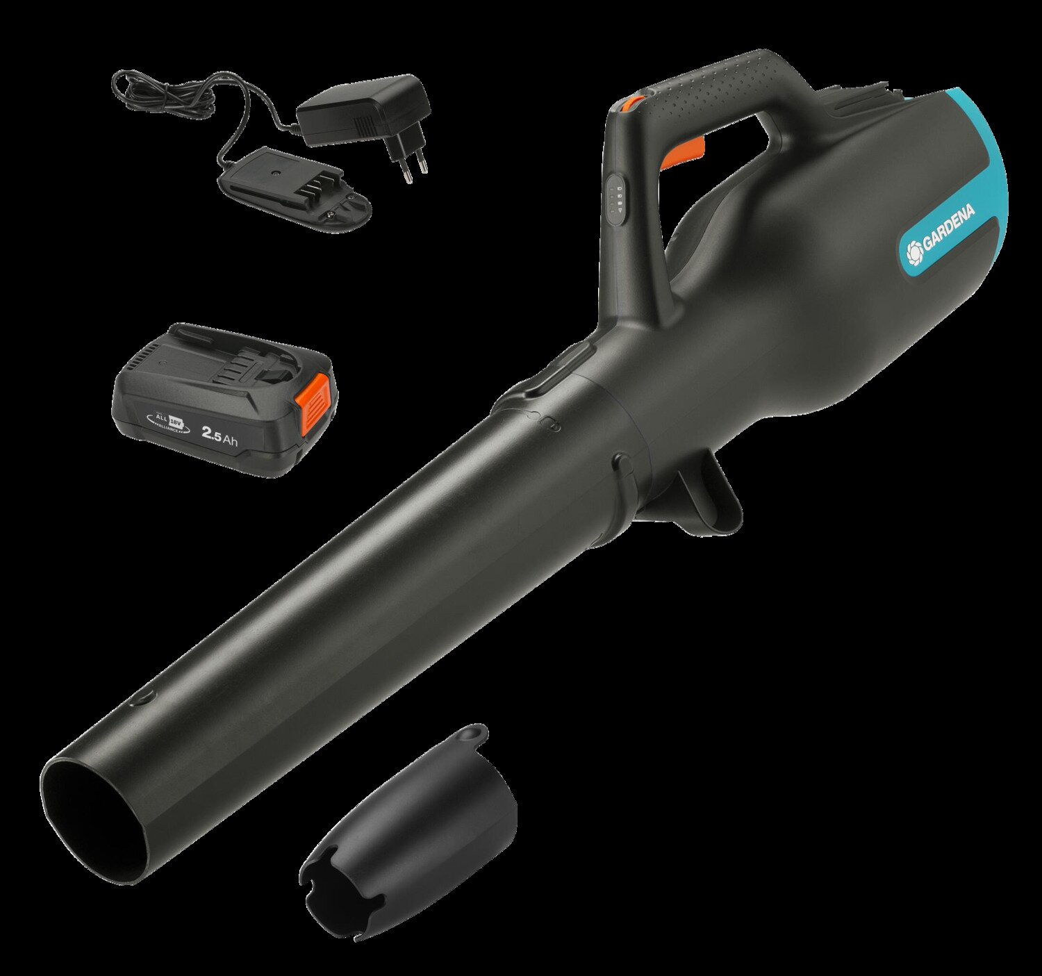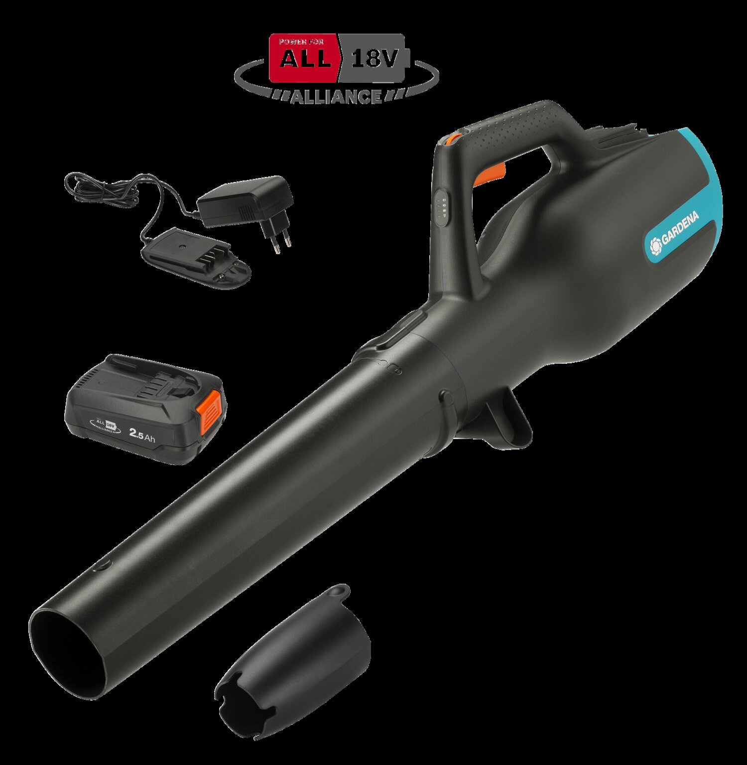 "De PowerJet 18V P4A kant-en-klare set van GARDENA is een accu-aangedreven bladblazer waarmee u de tuin flexibel, snel en effectief kunt opruimen. Dit veelzijdige product is ideaal voor gebruik in de tuin en rondom het huis. De bladblazer maakt niet alleen indruk met zijn slimme en functionele ontwerp, maar vooral met zijn opmerkelijk krachtige blaasprestaties. Of het nu gaat om bladeren, kleinere takken of gemaaid gras, de PowerJet blaast ze snel, krachtig en efficiënt weg. Dankzij het innovatieve ontwerp en de hoge luchtstroom ziet uw tuin er in een mum van tijd verzorgd en opgeruimd uit. De blazer maakt indruk met een maximaal luchtvolume van 7,9 kubieke meter per minuut voor geweldige blaasprestaties en stelt u in staat een gebied tot 400 vierkante meter schoon te maken. Afhankelijk van gebruik en tuintoepassing kan het toerental van de bladblazer individueel worden aangepast. Dankzij het lage gewicht is het werken met de bladblazer uiterst comfortabel en gemakkelijk, zelfs gedurende de volledige maximale looptijd van 13 tot 23 minuten, afhankelijk van de ingestelde vermogensmodus. De blazer is ook zo goed uitgebalanceerd dat er geen vermoeidheid is in de polsen en armen. Dit wordt nog versterkt door de uitstekende ergonomie van het product. Een duidelijk zichtbare LED-display op het apparaat toont het huidige laadniveau van de accu. Met de bijgeleverde precisiesproeier kan u nog preciezer werken in die lastige hoekjes in uw tuin. De krachtige, compacte en handige GARDENA accu-bladblazer is daarom ideaal voor een breed scala aan schoonmaakklussen. De accubladblazer 18V P4A wordt geleverd als een gebruiksklare set met een oplader en een 2,5 Ah 18V POWER FOR ALL accu. De POWER FOR ALL ALLIANCE is een van de grootste merkoverschrijdende accu-allianties van toonaangevende fabrikanten. Deze accu's kunnen worden gebruikt voor tal van andere apparaten in huis en tuin - u hoeft er dus niet langer voor elk product een te kopen. U bespaart geld en blijft flexibel!"