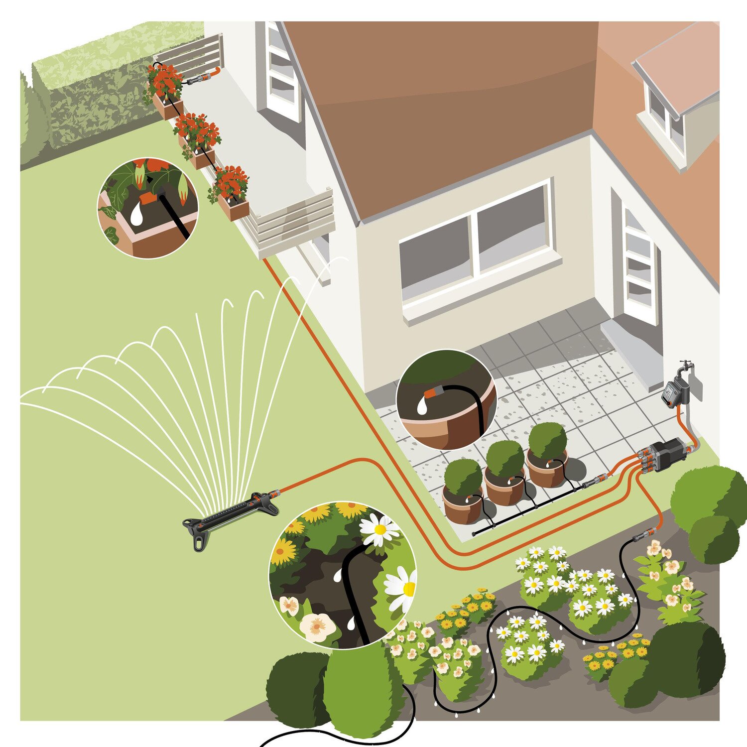 Zo kunt u het gazon besproeien met een sproeier en vervolgens potplanten, perken, hagen en bloembakken met een druppelirrigatiesysteem. Omdat de verschillende planten in uw tuin verschillende hoeveelheden water nodig hebben, kan de besproeiingsduur ook individueel worden ingesteld op basis van de programmering op de Water Control. Deze intelligente oplossing is ook ideaal wanneer de beschikbare waterhoeveelheid onvoldoende is voor gelijktijdige toevoer van alle besproeiingsaccessoires.