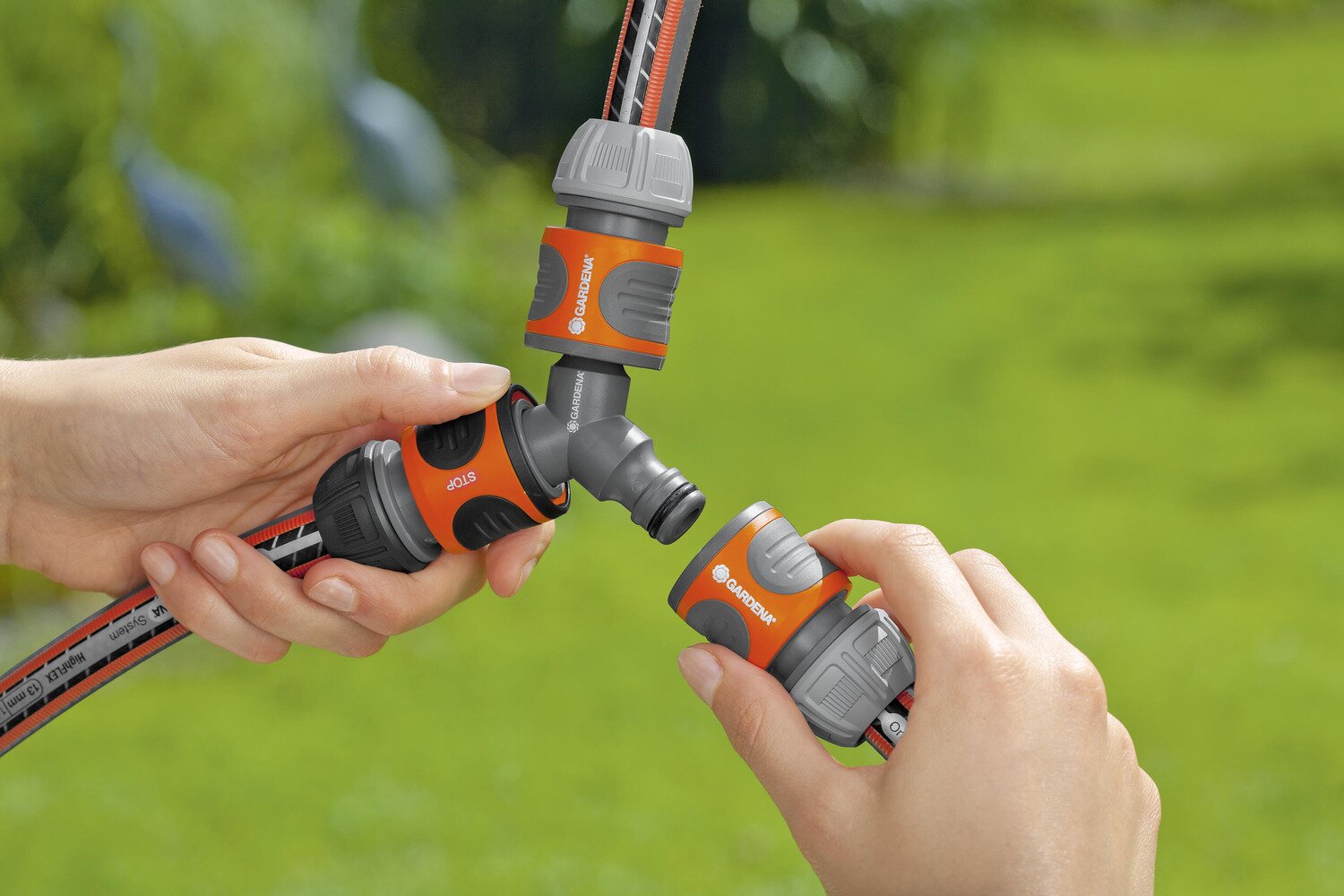 Een bekend probleem. Eén waterbron beschikbaar en u wilt twee sproeiapparaten tegelijk gebruiken. Door een 3-wegstuk te gebruiken, kunt u de tuinslang eenvoudig splitsen. U kunt dan met een sproeier het gazon besproeien en tegelijkertijd met een broes de bloembedden water geven. Het 3-wegstuk is geschikt om van een 19 mm (3/4") slang over te gaan op 13 mm (1/2") slangen.