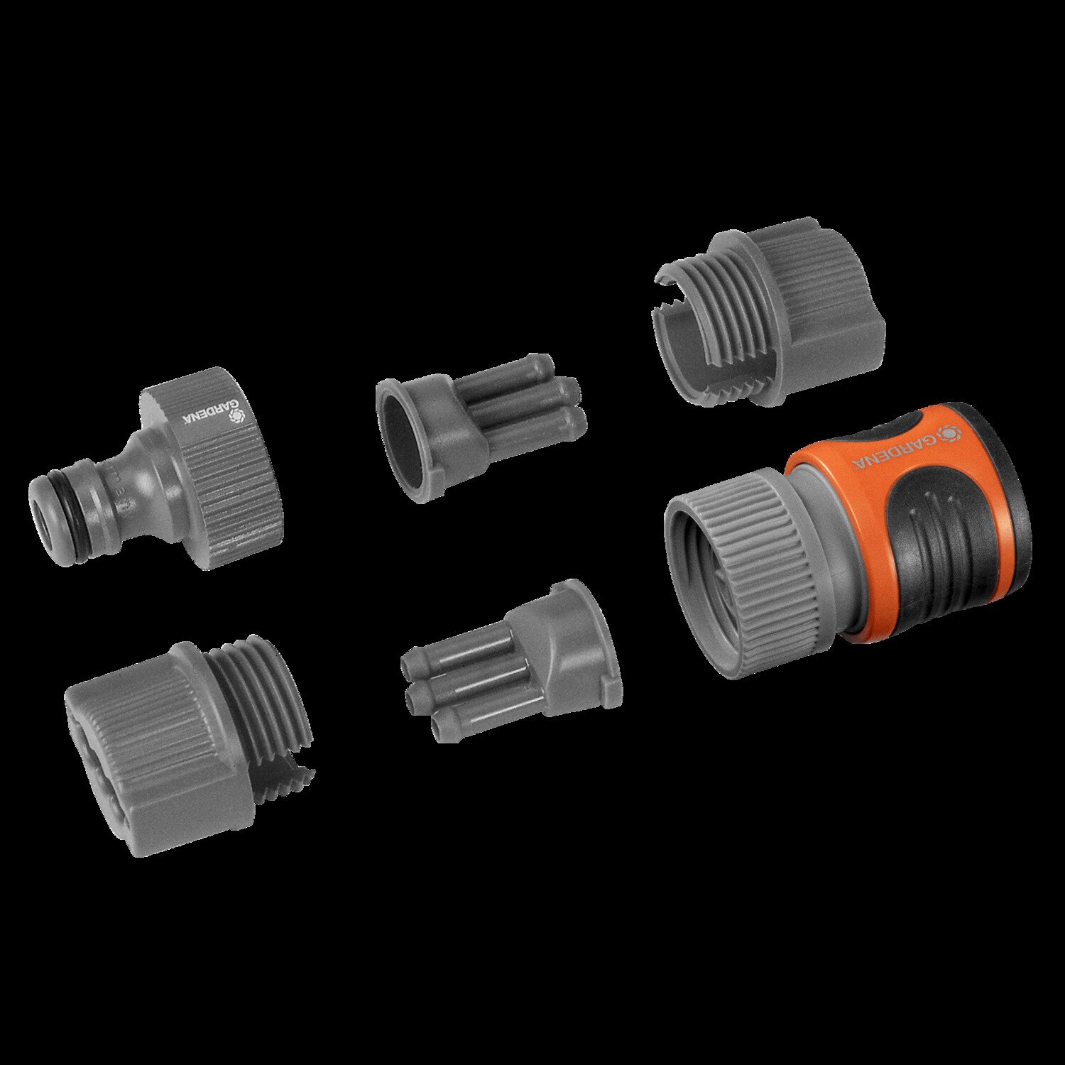 Het GARDENA Aansluitgarnituur voor sproeierslangen bevat alle aansluitstukken voor het Original GARDENA System voor aansluiting op de GARDENA Sproeierslang - bij de inlaat en uitlaat van de slang. De aansluitstukken kunnen gemakkelijk worden gemonteerd.