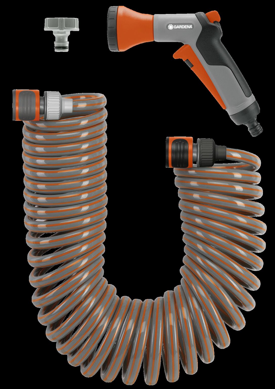 De spiraalslang-set is de handige oplossing voor het water geven van planten op balkons of terrassen of in zeer kleine tuinen. De slang wordt aan de muur gemonteerd. Na gebruik veert de slang automatisch weer terug tot minimale afmetingen. Dat maakt lastig op- en afrollen van de slang overbodig. De slanglengte is 10 m, ideaal voor het water geven van planten op kleine oppervlakken. De meegeleverde pistoolbroes ligt goed in de hand, de waterhoeveelheid kan traploos worden geregeld en de impulsgreep kan desgewenst worden ingesteld. De GARDENA spiraalslang-set is het praktische en complete systeem voor het sproeien van kleine tuinparadijsjes. Met pistoolbroes (art.nr. 8120), kraanstukken (art. nr. 900, 901 en 902) en wandhouder.