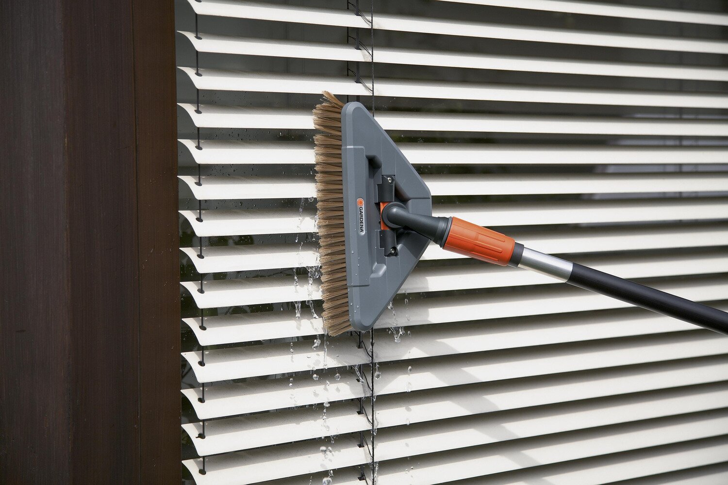 De GARDENA zwenkwasborstel kan op het waterleidingnet worden aangesloten en is voorzien van een Original GARDENA System-aansluiting. De GARDENA zwenkwasborstel heeft een praktische driehoekige vorm voor gebruik op niet-toegankelijke plekken. U kunt zonder problemen in hoeken en bochten komen die moeilijk toegankelijk zijn met andere borstels. Het draaischarnier helpt u daarbij. Het kan 360° draaien. De wasborstel is flexibel en eenvoudig in gebruik voor alle plekken. De borstel kan worden gebruikt met alle Original GARDENA Cleansystem Waterstelen (art. nr. 5552-20, 5550-20, 5554-20). Met de hoogwaardige borstelharen en een werkbreedte van 27 cm of 13 cm is deze borstel geschikt voor het zorgvuldig reinigen van kwetsbare oppervlakken, zoals rolluiken, kassen en serres. Met deze wasborstel wordt schoonmaken heel eenvoudig.