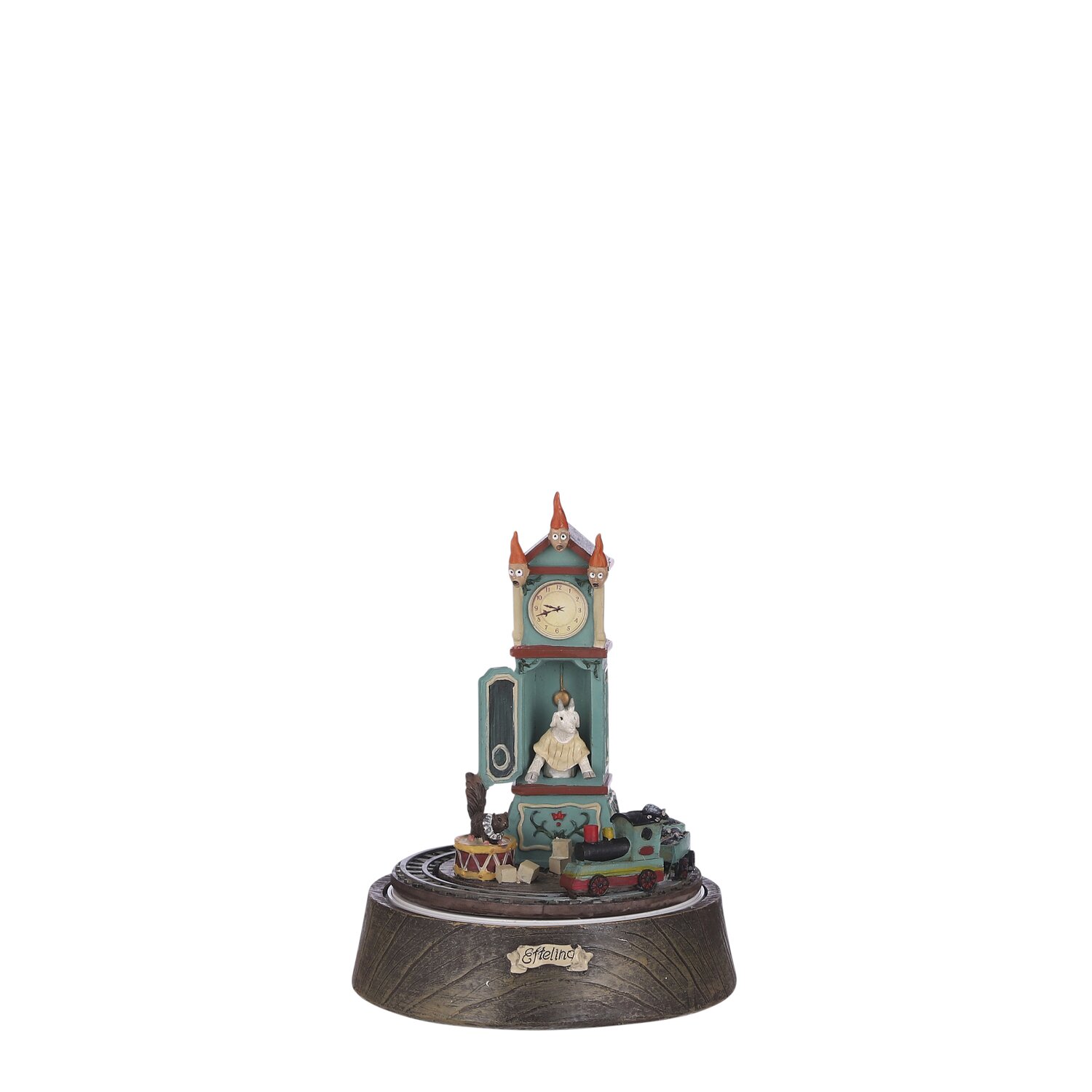 De Efteling is een wonderbaarlijke wereld waar sprookjes tot leven komen. Nu kan je hier ook thuis van genieten. Maak jouw Luville sprookjesbos compleet met dit beeld uit het sprookje van de Zeven Geitjes. Het zevende geitje heeft zich in de klok verstopt voor de wolf. Rond de klok rijdt een treintje op een spoor. De miniatuur werkt op 3 AA batterijen (exclusief), maar kan ook worden aangesloten op een los verkrijgbare adapter. De afmetingen zijn H18 x D15 cm.