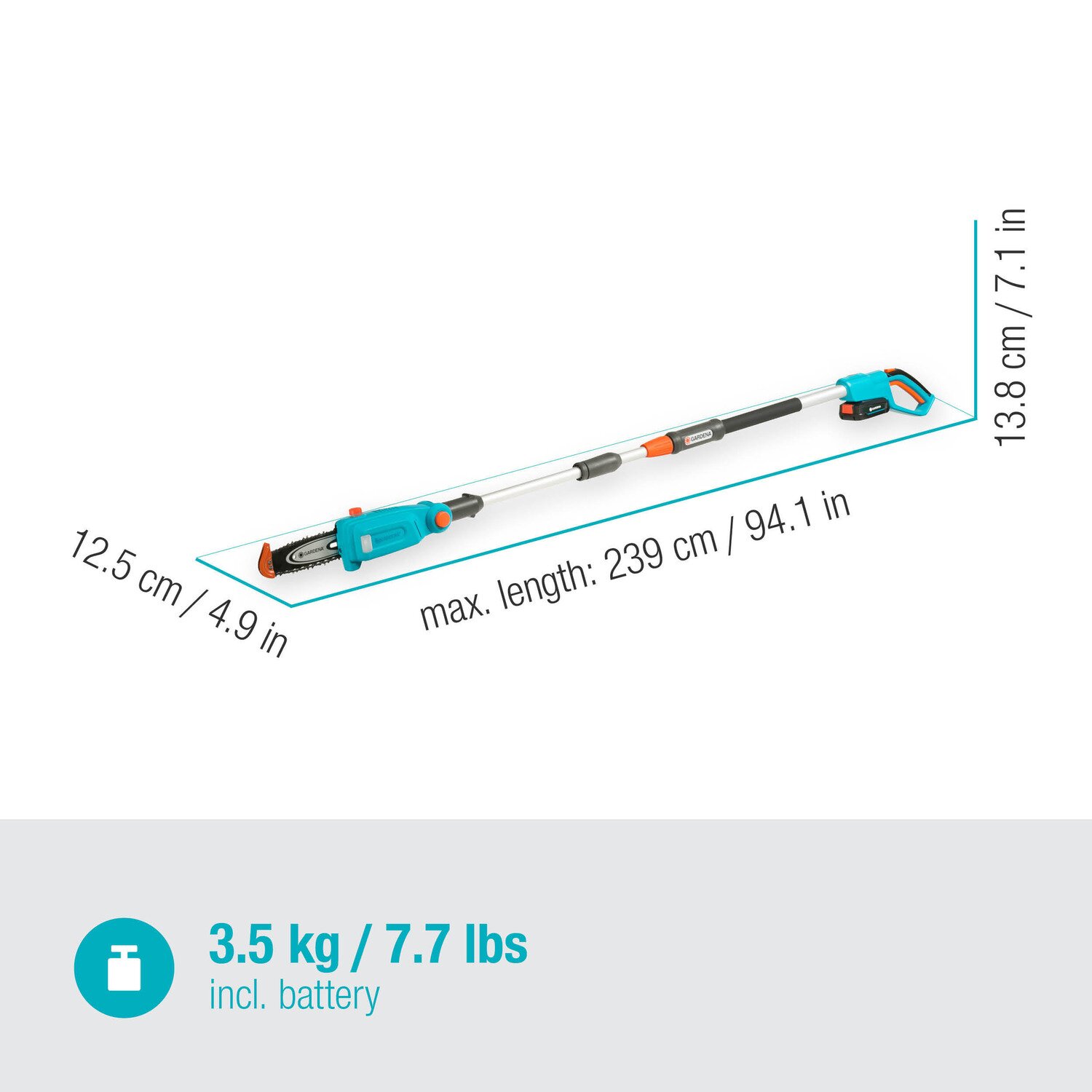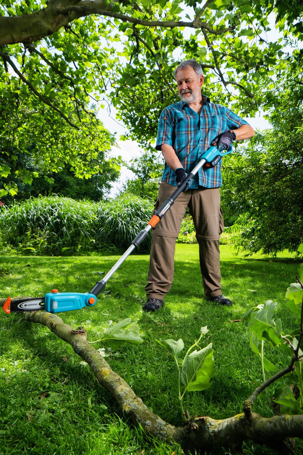 "De GARDENA accu-telescopische snoeischaar TCS 20/18V P4A is handig, compact en snoeit nauwkeurig. Met een bladlengte van 20 cm en uitschuifbare telescoopsteel bereikt u takken tot wel 4m hoog - zonder te moeten klimmen of jezelf in gevaar te brengen op een zwaaiende ladder. Doordat de telescoopzaag slechts 3,5 kilogram weegt, is er gemakkelijk mee te werken. De smalle snoeikop is praktisch op twee manieren: als u hem kantelt, kunt u krappe plekken in boomtoppen bereiken. En u kunt ook takken die op de grond liggen, fijnhakken zonder te hoeven knielen of bukken. Op deze manier kunt u de stekken in een handzaam formaat krijgen en gemakkelijk weggooien. Door de zaagsteun aan de punt van het zaagblad kan u de telescoopzaag stabiel houden. U kunt er ook takken mee trekken die al van de boom zijn gezaagd, als ze niet vanzelf op de grond vallen. En last but not least: het beschermt de ketting bij het zagen in de buurt van obstakels. Als u de snoeischaar wilt vervoeren of opbergen, kunt u deze eenvoudig en zonder gereedschap in twee delen scheiden. De GARDENA accu-telescopische snoeischaar TCS 20/18V P4A wordt geleverd als een gebruiksklare set met een oplader en een 18V POWER FOR ALL-accu met een maximale looptijd van maximaal 50 minuten of 200 sneden takken met een diameter van 50 millimeter. De POWER FOR ALL ALLIANCE is een van de grootste merkoverschrijdende accu-allianties van toonaangevende fabrikanten. De accu is daarom compatibel met tal van andere gereedschappen in huis en tuin, zodat u geld bespaart en altijd flexibel blijft."