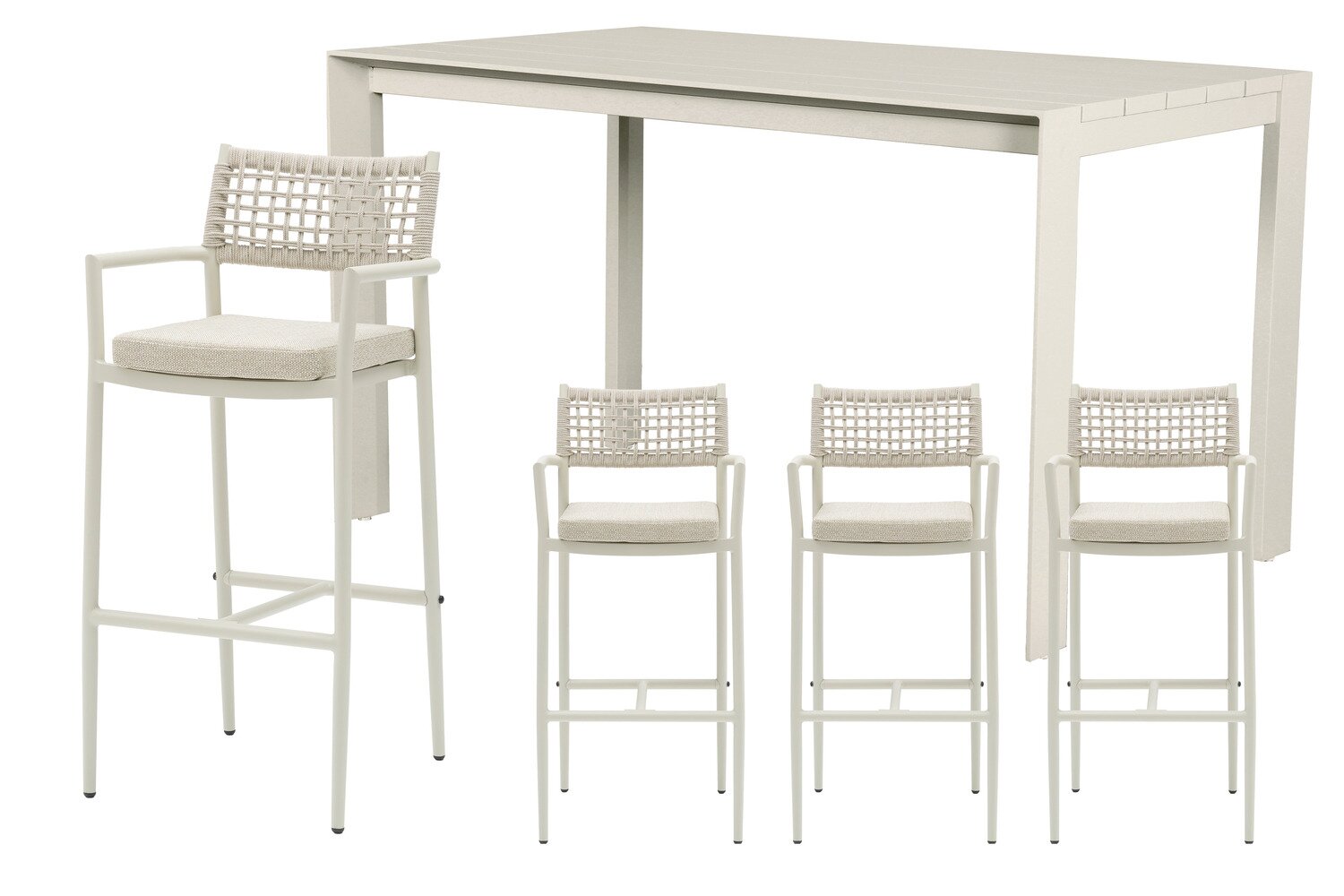 Met de Liv barset zand voor 4 personen van Ease Up® kies je voor een complete 4-persoons barset die comfort en uitstraling samenbrengt. De samenstelling met 4 Liv barstoelen en 1 Noordwijk bartafel maakt deze set geschikt voor dagelijks gebruik in de tuin of op het terras. Materialen als aluminium, touw (rope) en polyester zorgen voor een nette afwerking, prettig gebruiksgemak en een solide basis voor buiten.