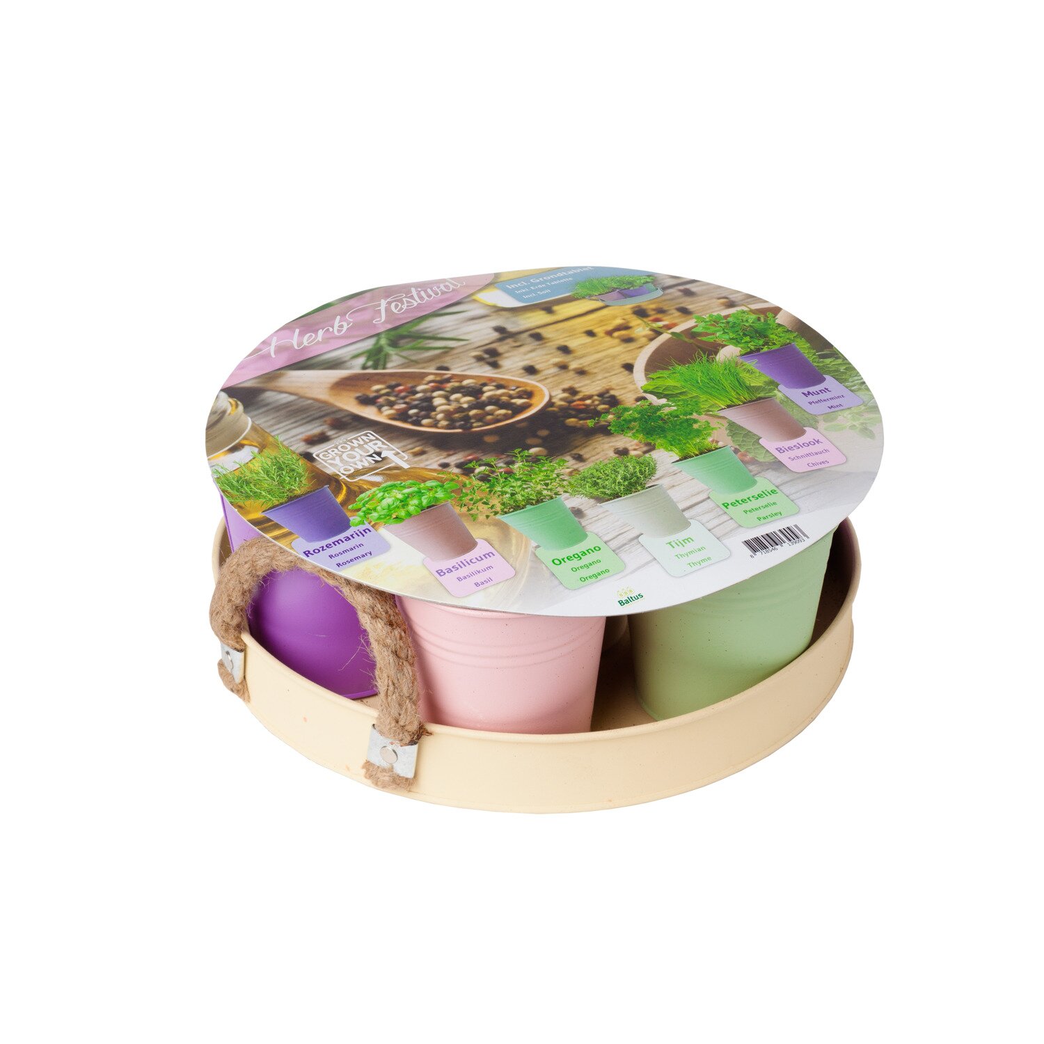 Rozemarijn, Basilicum, Oregano, Tijm, Peterselie, Bieslook en Munt. Daarnaast bevat de set potgrond en duidelijke plantinstructies om de kruiden goed te verzorgen.