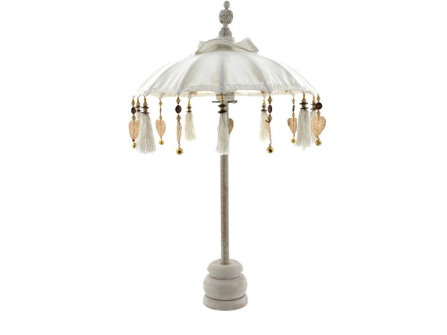 Ontdek de Van der Leeden Tafelparasol Bali Small Hearts in het wit bij Tuincentrum Coppelmans, een leuke toevoeging aan jouw buitenruimte! Met een diameter van 50 cm en een hoogte van 75 cm biedt deze kleine sierparasol perfecte schaduw voor jouw drankje op het terras. Gemaakt van 100% katoen en versierd met liefdevolle hartjesfranjes, voegt het niet alleen stijl toe, maar beschermt het ook tegen de zon. Compact en handig, is het een must-have voor gezellige buitenmomenten. Voeg een speelse touch toe aan je buitenruimte met deze charmante parasol!