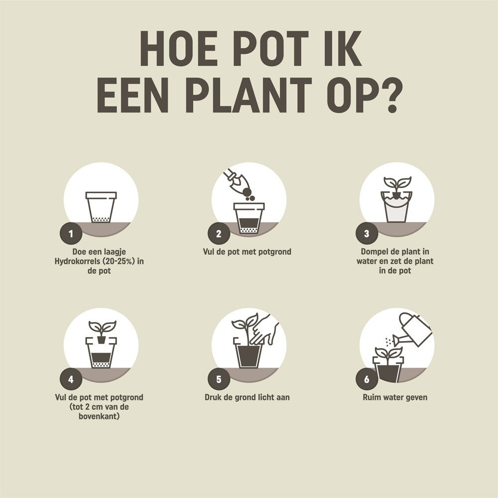 Gebruiksaanwijzing: Leg een laag hydrokorrels (20–25%) onderin de pot. Vul de pot gedeeltelijk met potgrond. Dompel de plant eerst in water en plaats deze in de pot. Vul de pot verder met potgrond tot ongeveer 2 cm onder de rand. Druk de grond licht aan. Na 180 dagen opnieuw voeding toevoegen voor een optimale groei.
