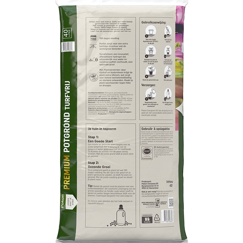 Pokon Premium Potgrond Turfvrij is een hoogwaardige potgrond voor sterke en gezonde planten. De potgrond bevat een langwerkende meststof die tot 180 dagen voeding geeft, zodat je planten langdurig voorzien zijn van de juiste voedingsstoffen. De potgrond is verrijkt met perliet, wat zorgt voor een extra luchtige structuur. Hierdoor kunnen wortels zich beter ontwikkelen en krijgen ze voldoende zuurstof. Daarnaast bevat deze potgrond TerraCottem, een innovatief en biologisch afbreekbaar hydrogel dat grote hoeveelheden water en voedingsstoffen vasthoudt. Dit helpt planten beter te groeien en maakt ze minder gevoelig voor droogte. Ook is er een plantversterker toegevoegd. Door de combinatie van rijstkaf en actief bodemleven krijgen planten extra silicium, wat zorgt voor sterkere wortels en stevigere celwanden. Hierdoor worden planten beter bestand tegen hitte en droge periodes.